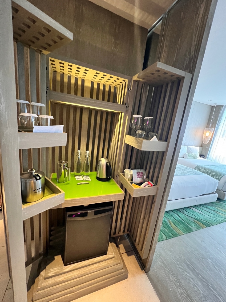 冷蔵庫の中には、絞りたてのスイカジュース、フルーツ、ミネラル、ジュースなどなど。冷蔵庫の横にはネスプレッソとかお茶セットとお菓子、なんとカップラーメンまでありました!!もちろんこれらもコンプリメンタリー♪