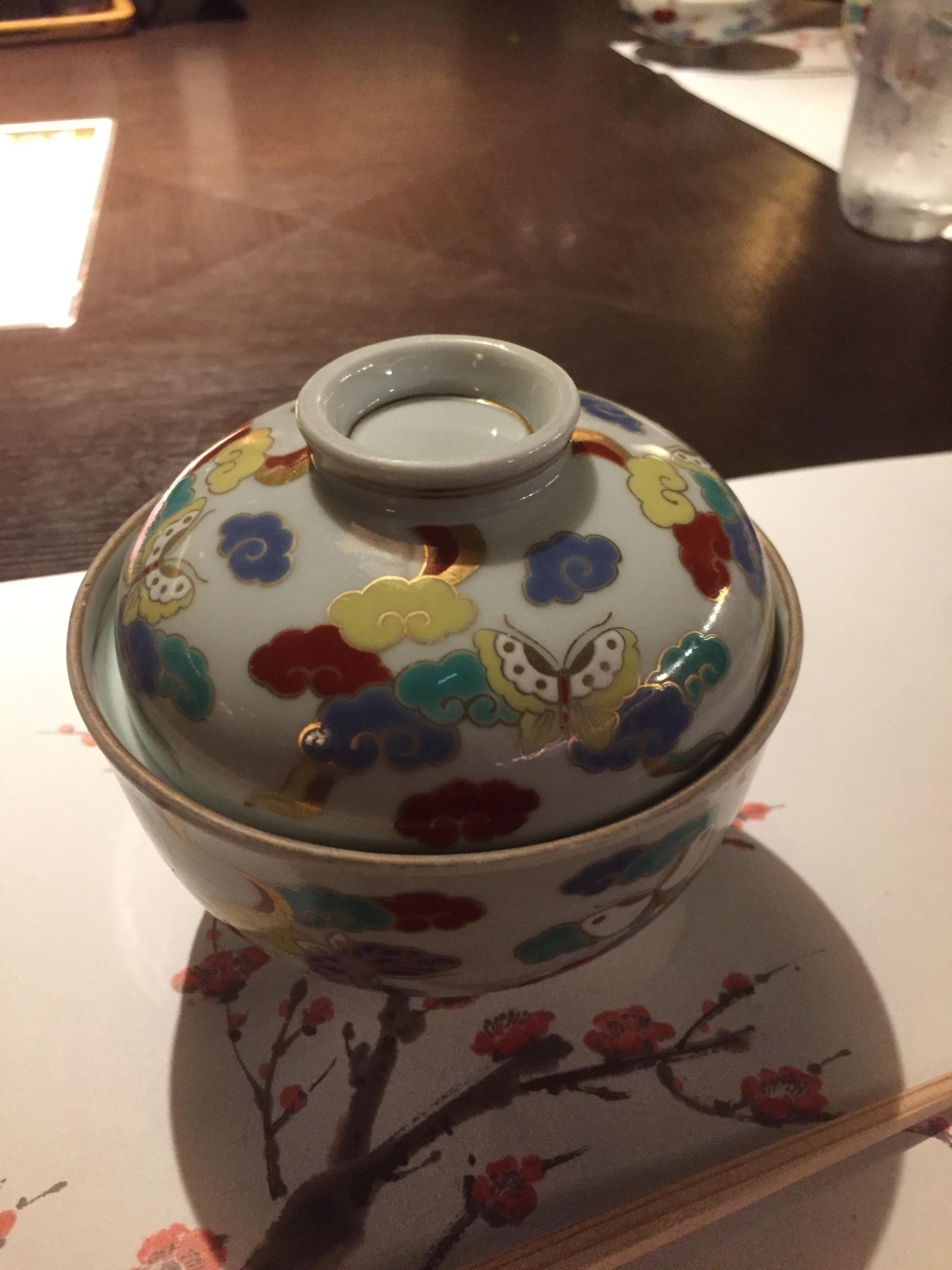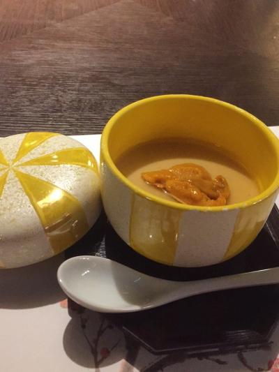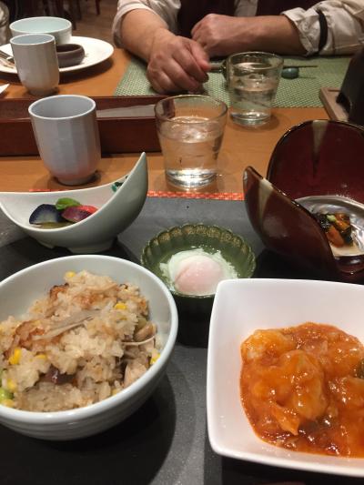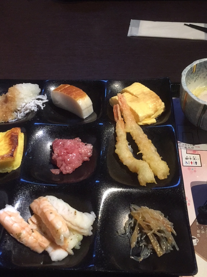 レストランに向かうのにフロント前(エントランス)を通ることはちょっと苦手です。私たちは浴衣姿、これからチェックインする人とひととき混在します。広いロビーとは仕切られた通路をすれ違う設計です。お土産売り場を過ぎて食事会場があります。夕食のうにの茶碗蒸し、にぎり寿司はとても美味しかったです。