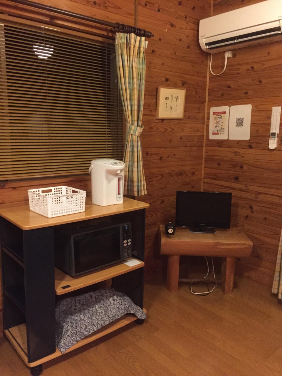 ホットプレート、炊飯器、ガス、ポット、冷蔵庫、フライパン、テレビ、食器類、浴衣、タオル、一通りそろっていた。管理棟の前で手持ち花火はできるとのこと。
