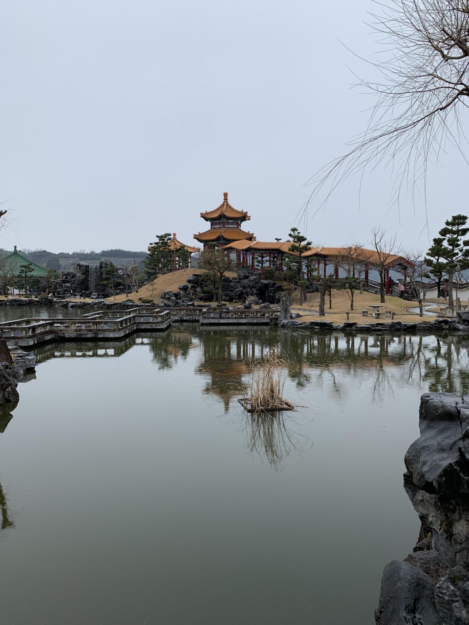 ひっそりと静かでした。湖畔を渡る風は時折小雨を運んできて寒かったです。パフォーマンスのショーが始まる時刻まで見学出来ませんでした。- 旅行時期