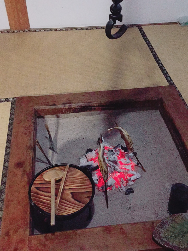 囲炉裏のそばでお部屋食、山の芋の鍋が美味しかったです。