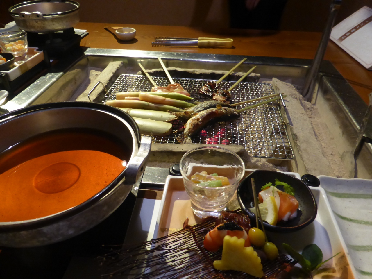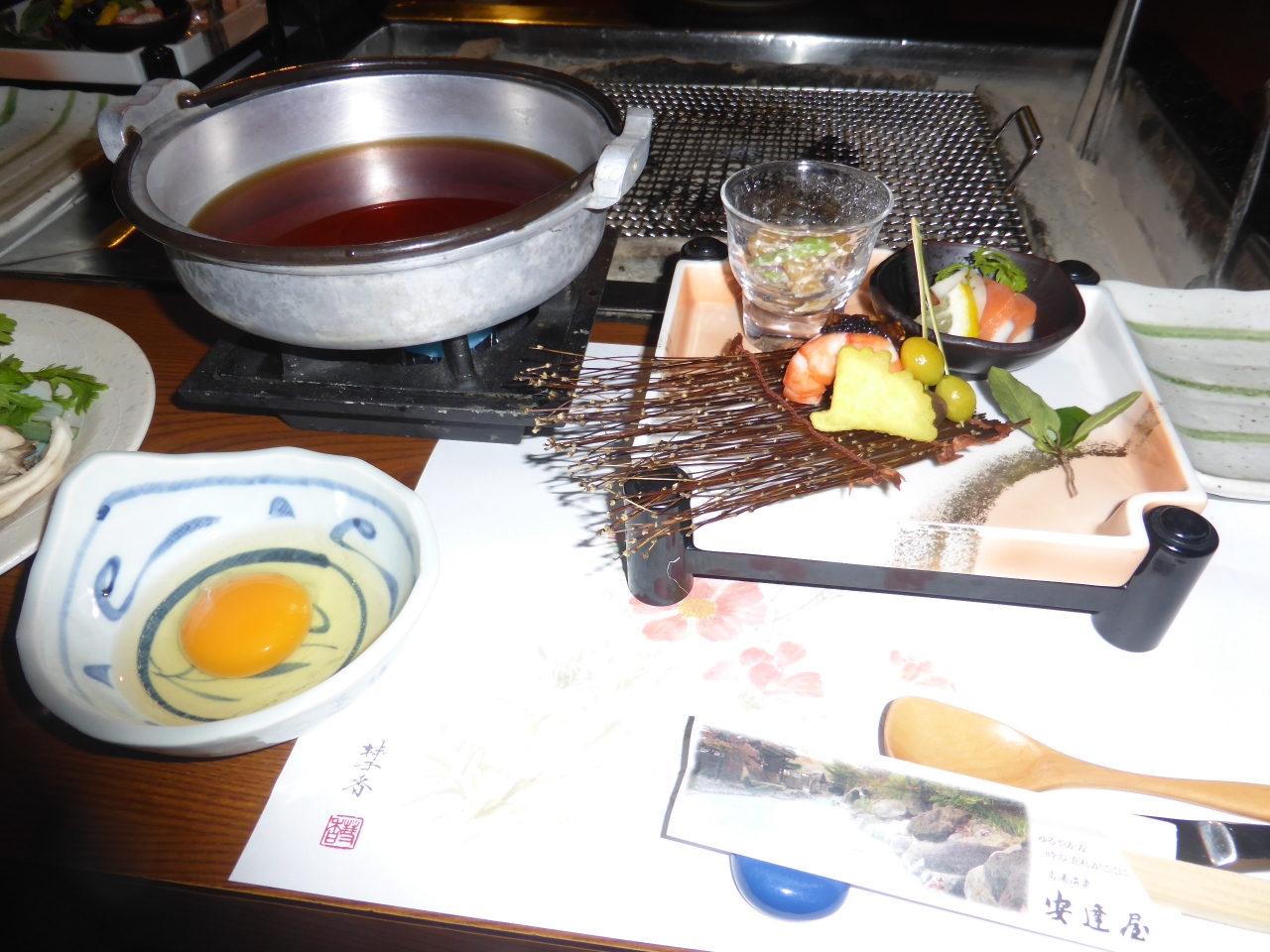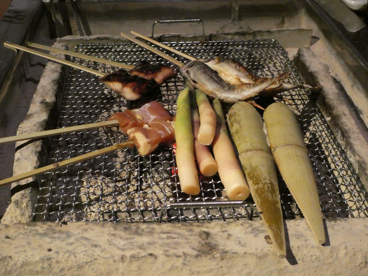 夕食は、ナマズの刺身、鴨鍋、いろりでイワナの塩焼き、笹のタケノコなど山の幸が並びます。福島三泊旅行で最終日に泊まりました。一番コスパが良く、温泉、食事に満足の旅館でした。
