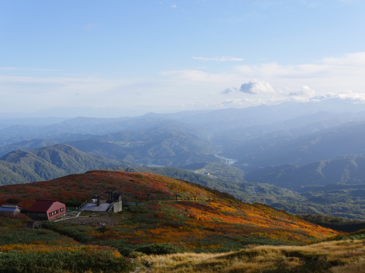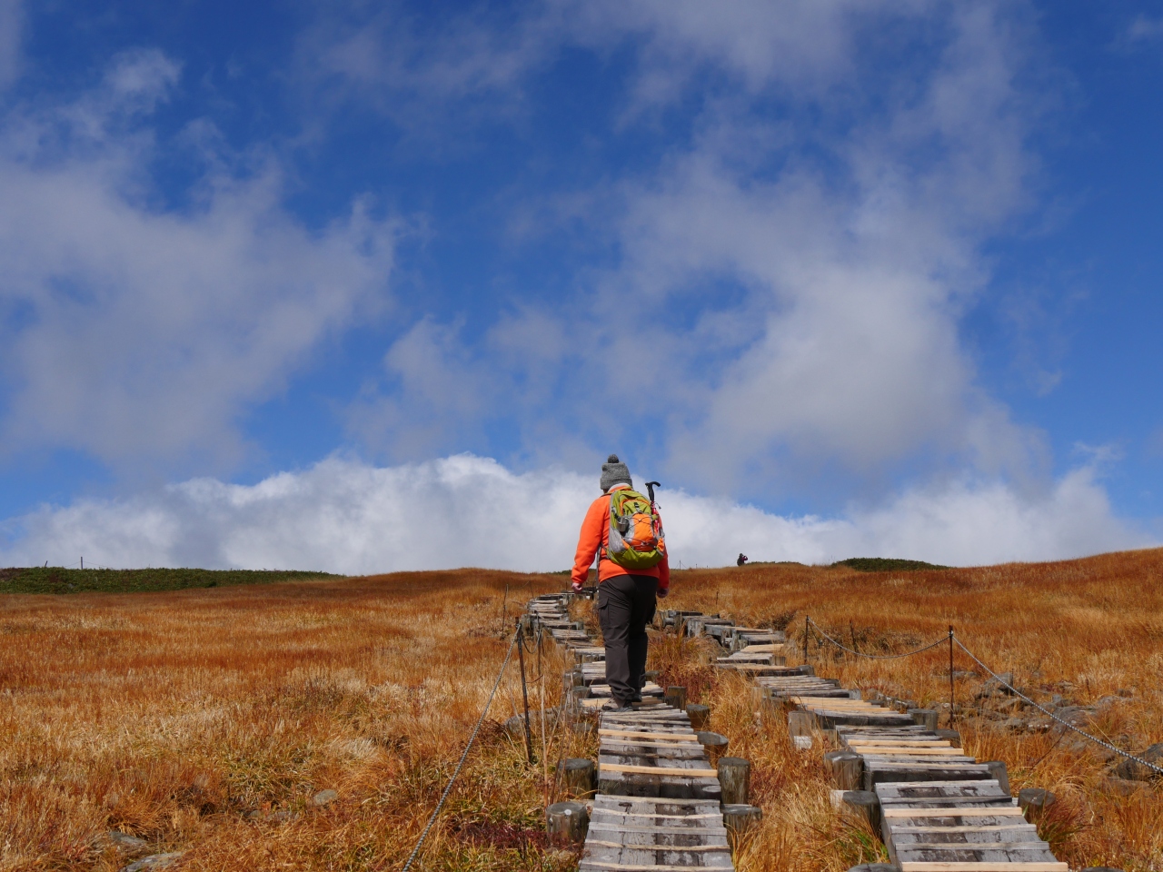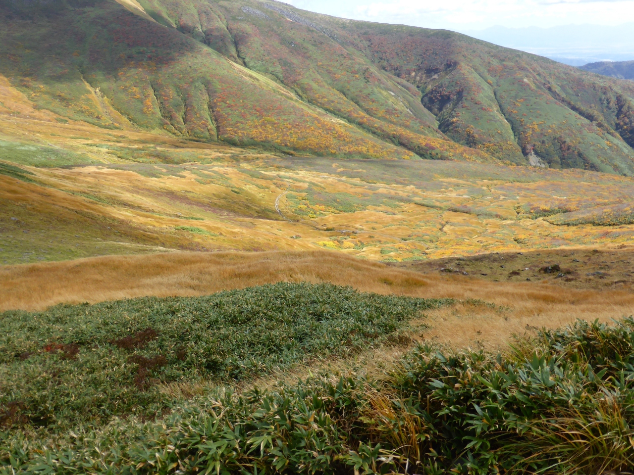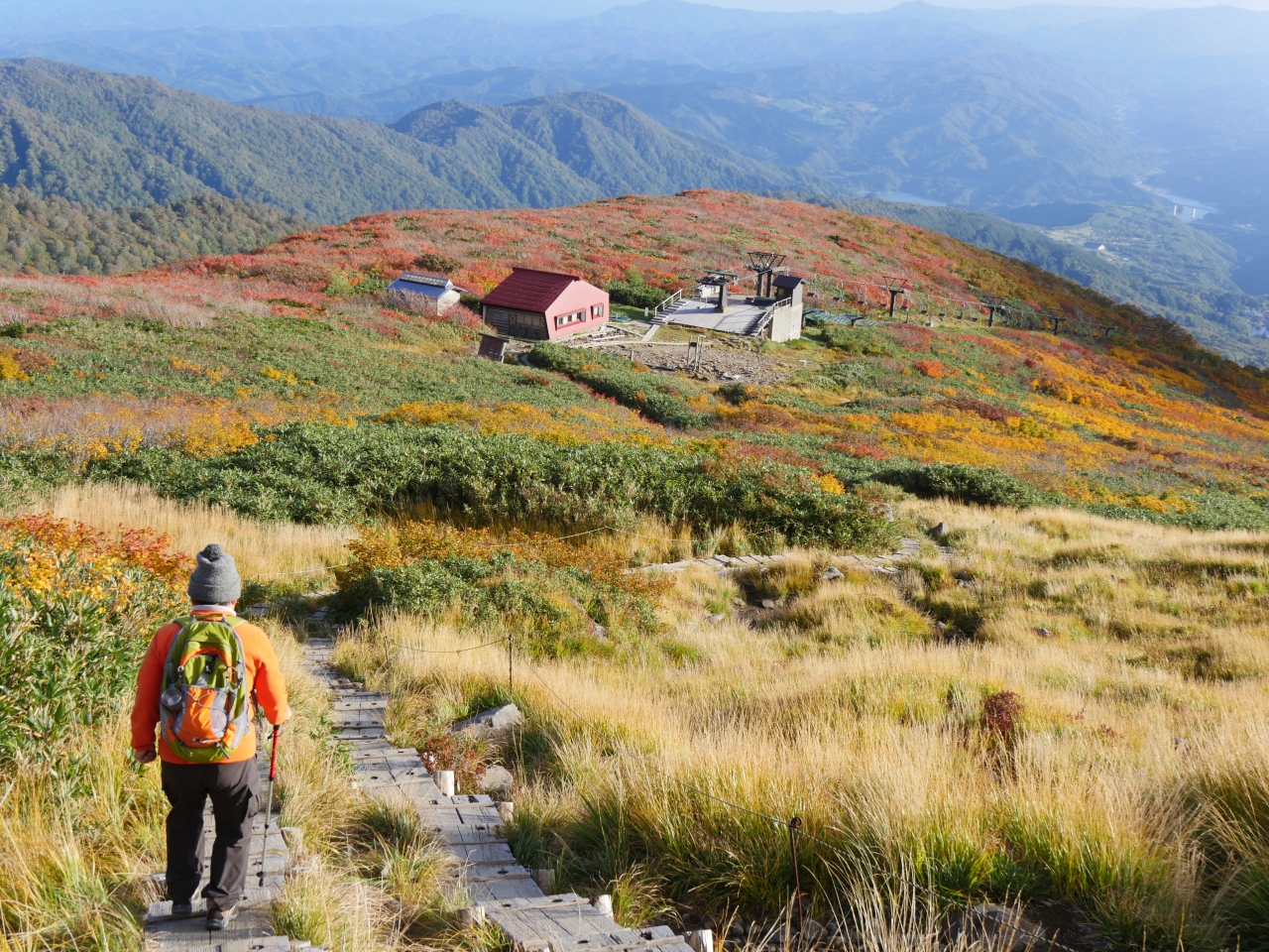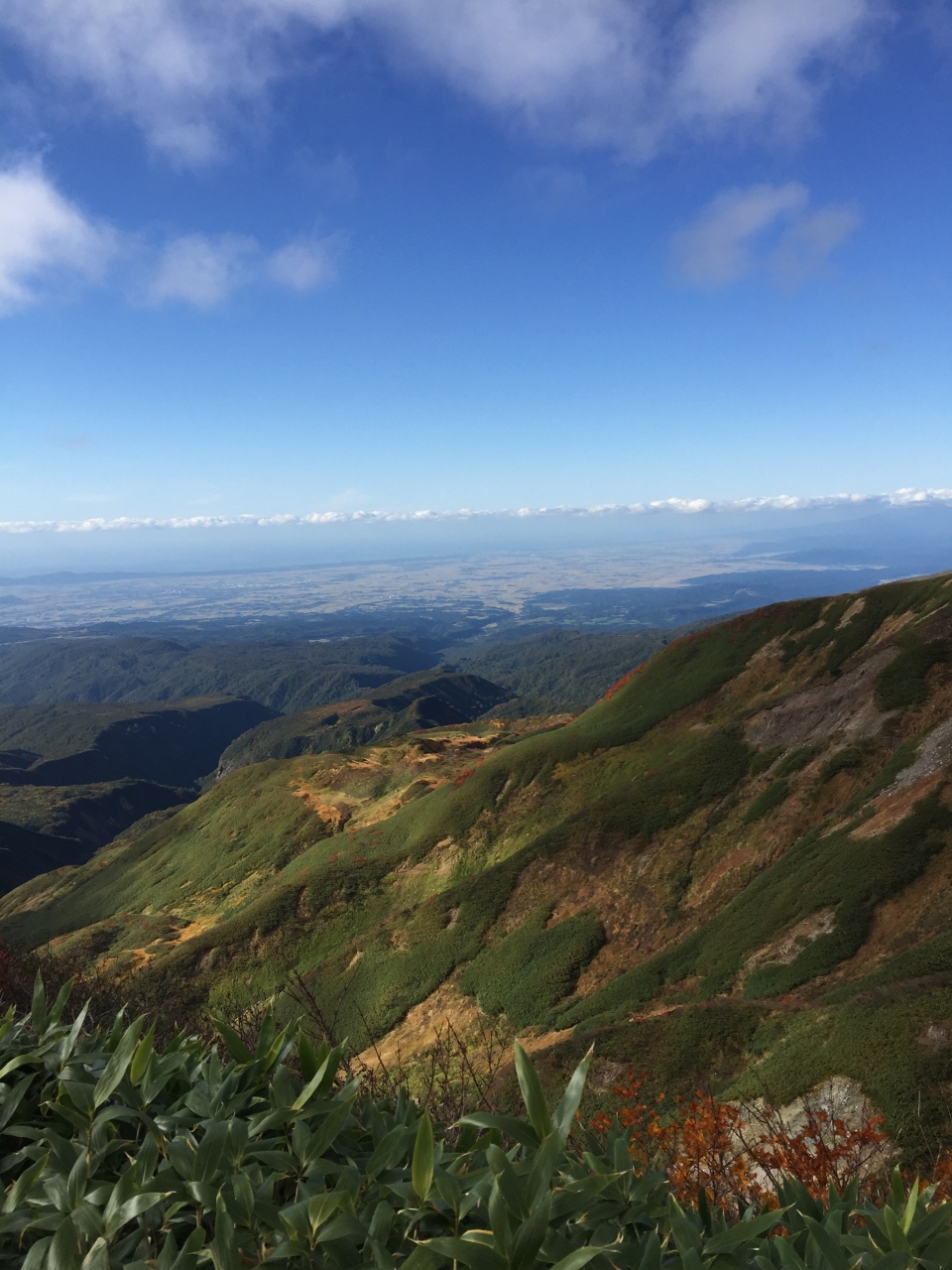 念願の月山登山、月山インターから20分、リフトのしたの駐車場に到着。10月初旬月山の頂上付近に紅葉の照準をあてたつもりが山頂は草紅葉だった、が山肌は錦にそまりとても綺麗で、大きくて優しい山容に感激した。遙々足をはこんだ甲斐があった。姥が岳経由で休憩無しの登り2時間半、下り2時間の滞在、リフトの係員の方のアドバイスで14時に山頂を出発して16時にリフト乗り場についてリフト最終便16時20分に乗ることができた。日本海と庄内平野が見渡せた。