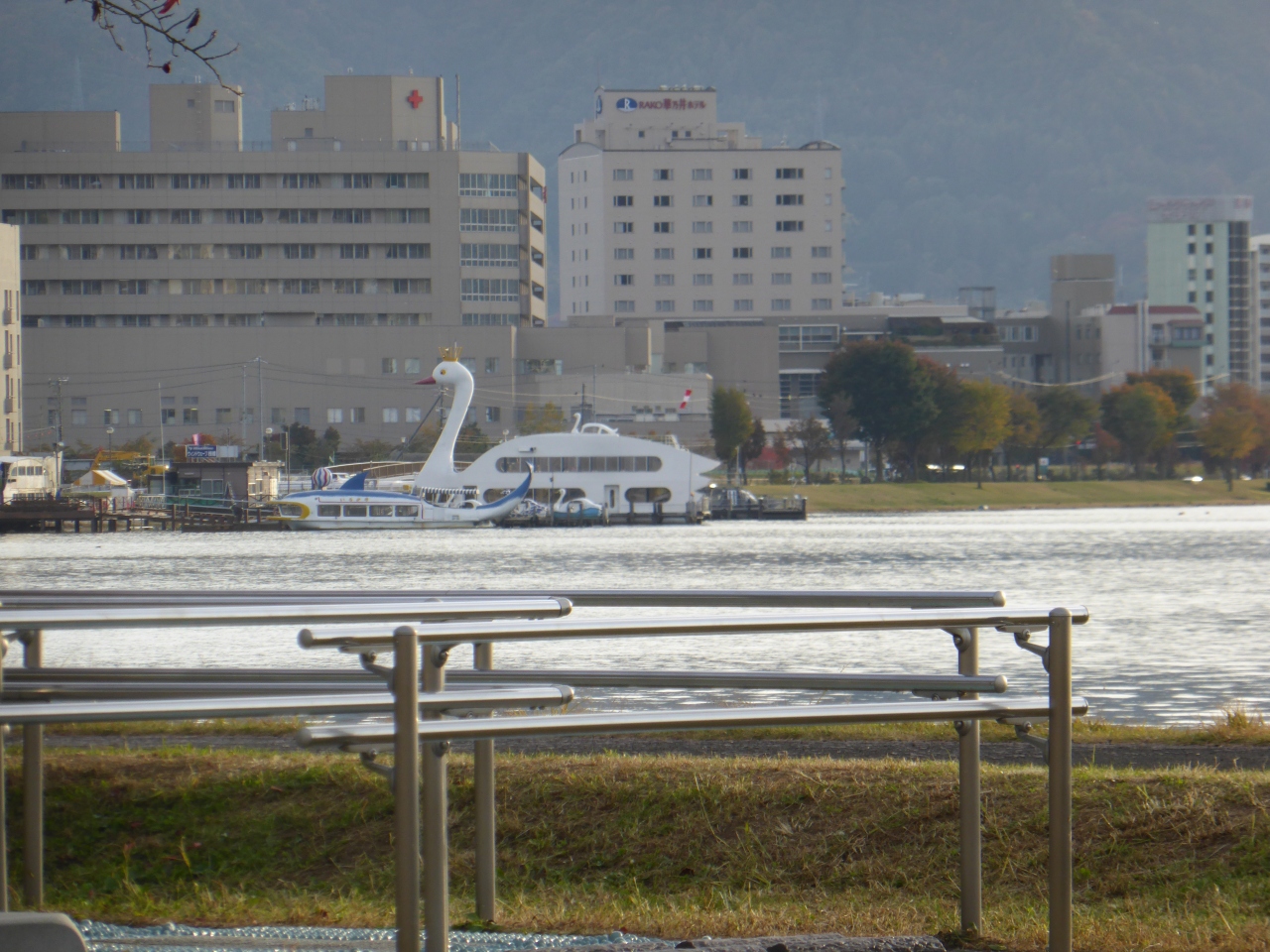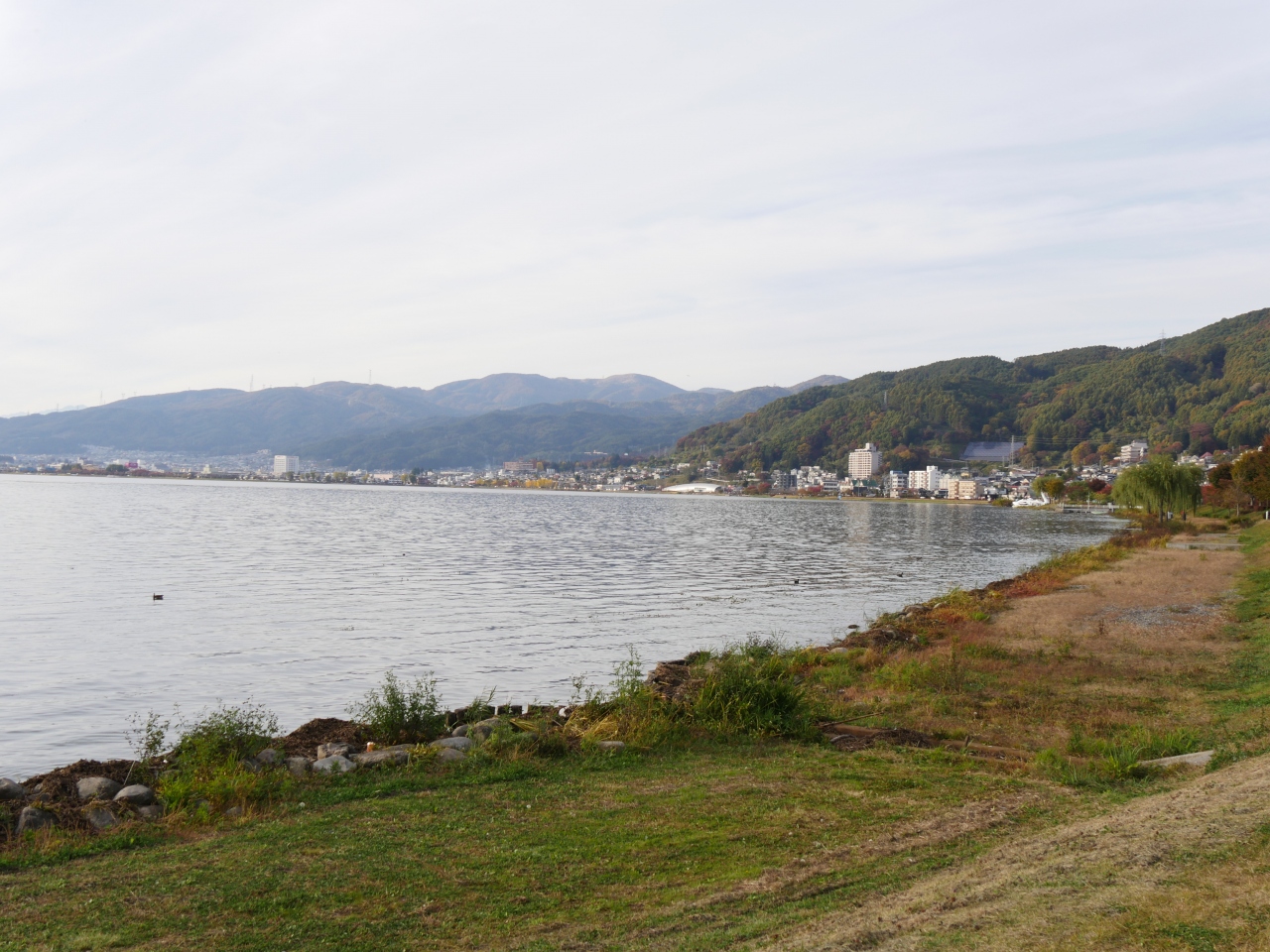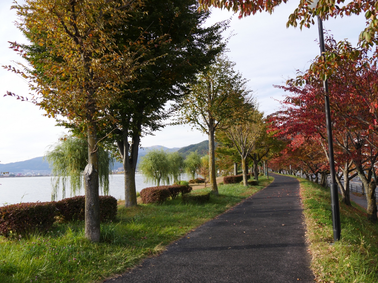 足湯につかりながら湖を眺めると紅葉に染まった湖周辺はとても風情があります。美術館やタケヤみそ工場、売店などがあります。湖畔は犬と散歩したりジョギングしたり、地元の人の憩いの場のようでした。ホテルの高層階からのロケーションは素晴らしいだろうと思います。