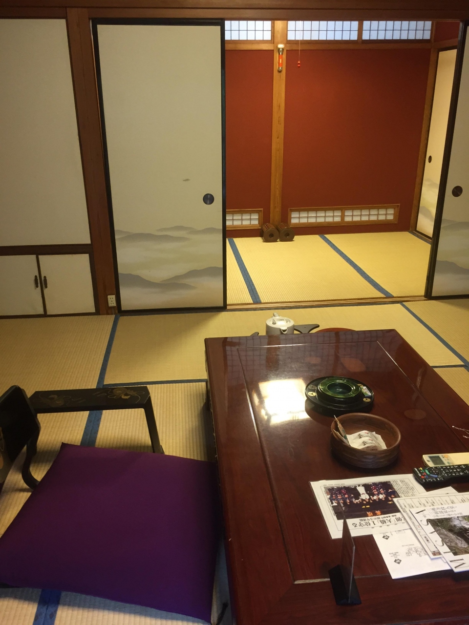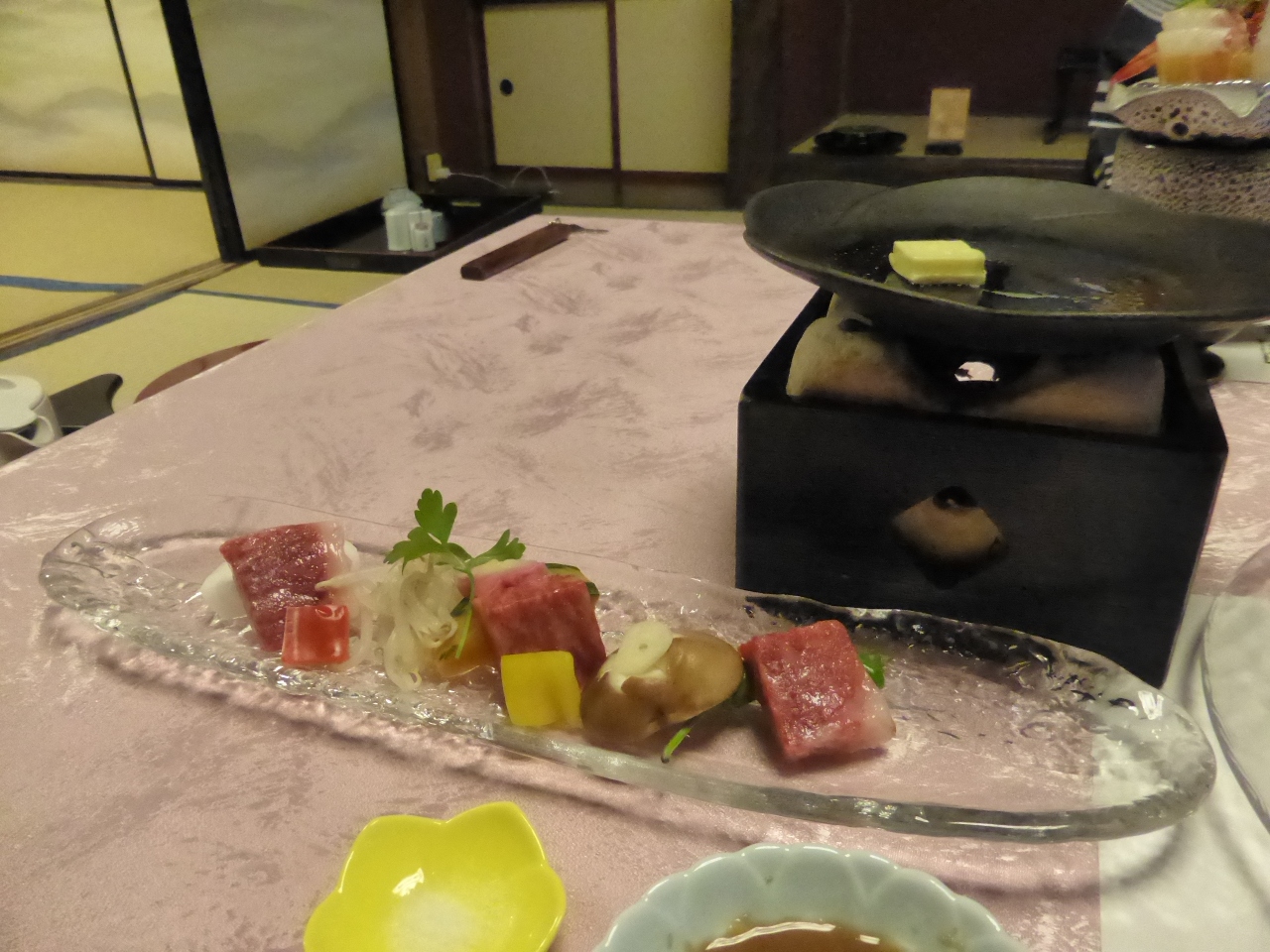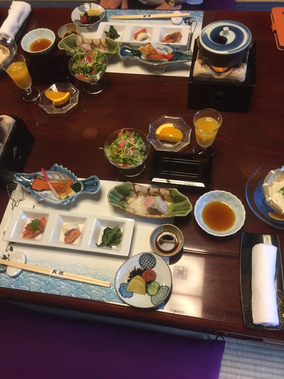 温泉は川沿いの1階に二カ所、川底から湧く温泉です。岩風呂3つの湯船が川上に、露天風呂と内風呂が川下にあり、男女入れ替え制です。趣のある温泉ですがいずれも階段があり、館内もエレベーターは無いので年配のかたや杖を使われる方は利用しにくいかと思います。川縁りの旅館なのでせせらぎとかじかの声が心地良いです。対岸には遊歩道があり浴衣で散歩していました。中学生の通学路でもあるようです。古い建物をとても大切にしてなおかつ清潔さも保たれています。朝夕ともにお部屋食で技を尽くしたお料理がきれいに並びました。お部屋食はどちらかというと苦手なので個室で食べたかったのですが、その選択肢は無かったようです。全く小食では有りませんが食べきれませんでした。山陰の鄙びた温泉情緒をたっぷり味わうことができます。