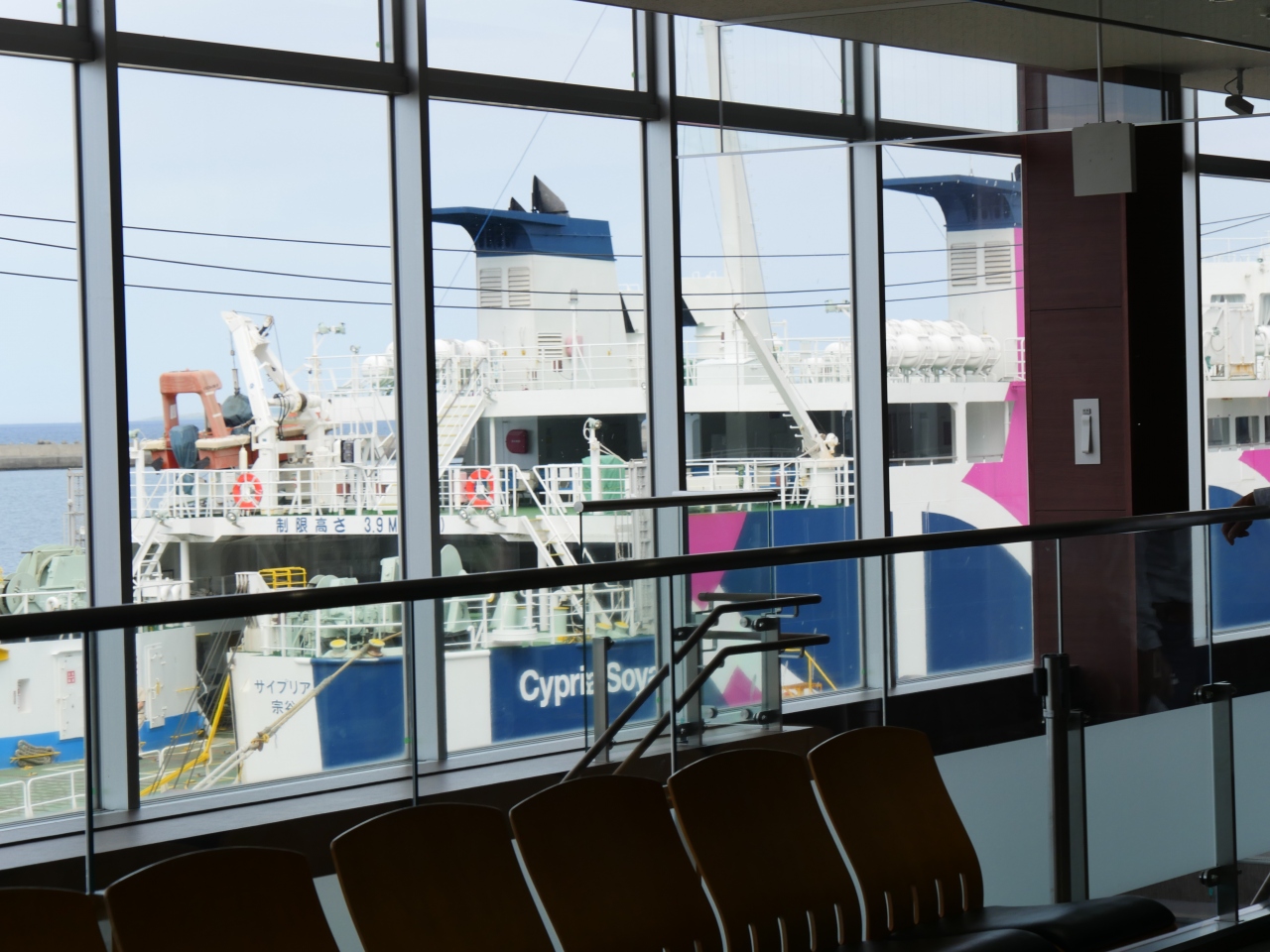 稚内空港からバスで600円、25分くらいで着きます。利尻、礼文への航路があります。ハートランドフェリーが出ています。国境の港なのでサハリンへの航路がありますが、船は見ることができませんでした。海上保安庁の巡視船が2隻停泊中でした。