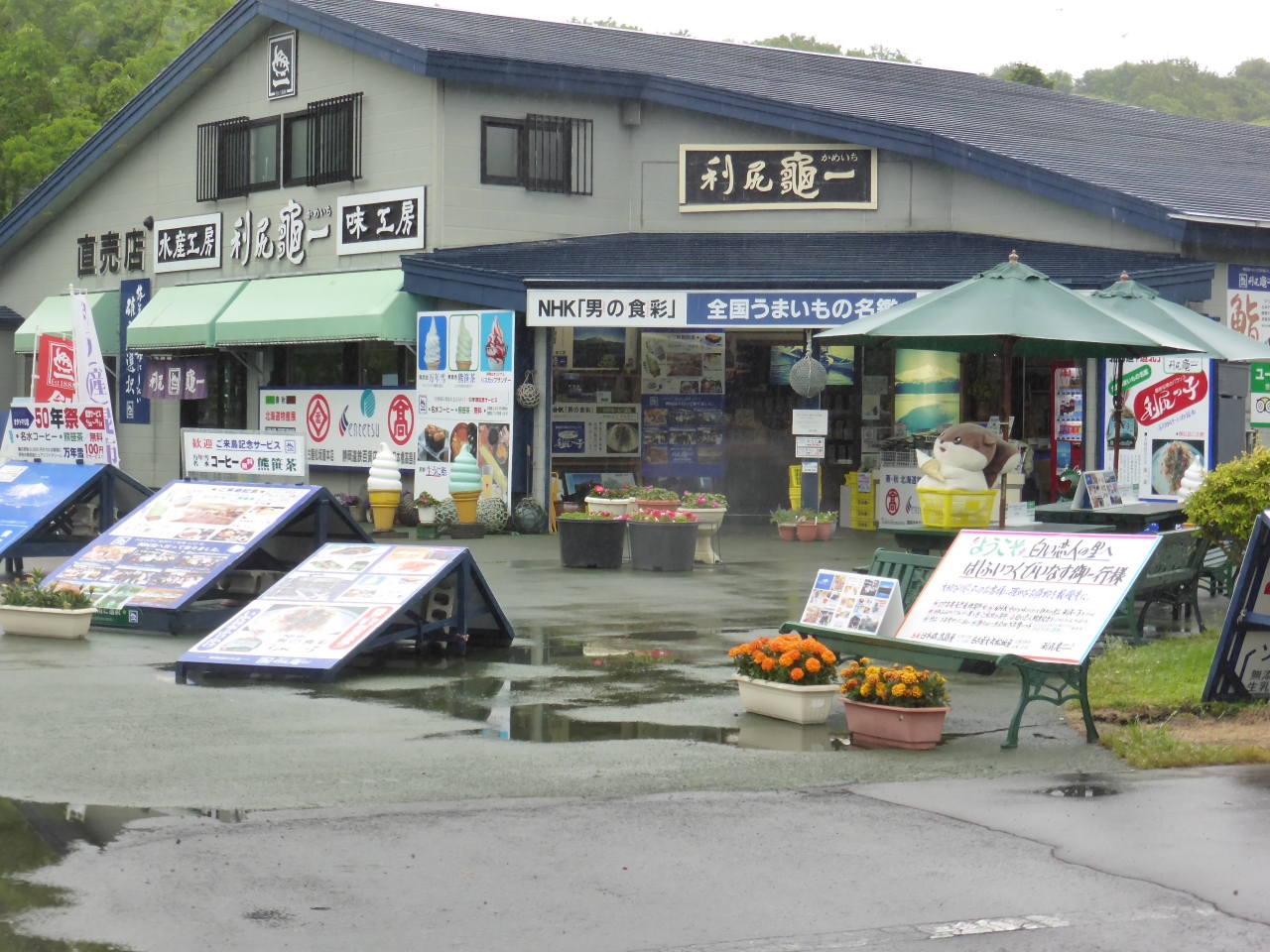 沓形フェリーターミナルのそばです。晴天であれば利尻富士がどーんと見えたはずですが、ちょっと残念でした。お土産店の店先はお花が咲いています、独特な店構えで狭い店内は色々品数多く並んでいました。クルーズ船が停泊していてお客さんが公園を観光中でした。利尻島の中では地味な観光地ですが、レンタカーで一周すると立ち寄りたくなる場所です。