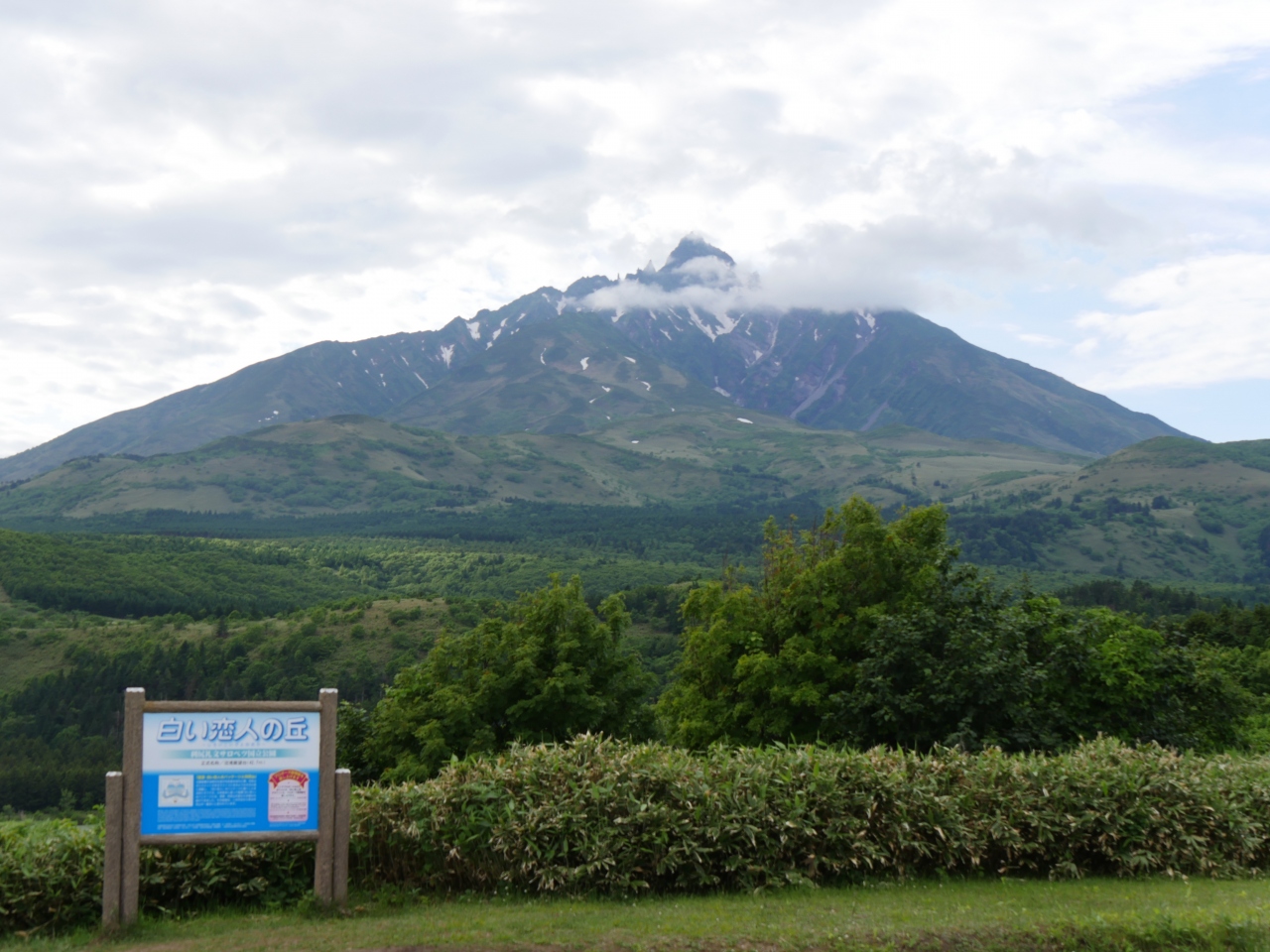 オタトマリ沼の近くです。利尻山からのスロープが迫力があります。少し高台なので沼から眺めるよりずっとずっと大展望が開けます。利尻島を2日続けて一周したので合計2周、この日は晴天で良かったです。遠くに海岸沿いの風力発電が見えました。