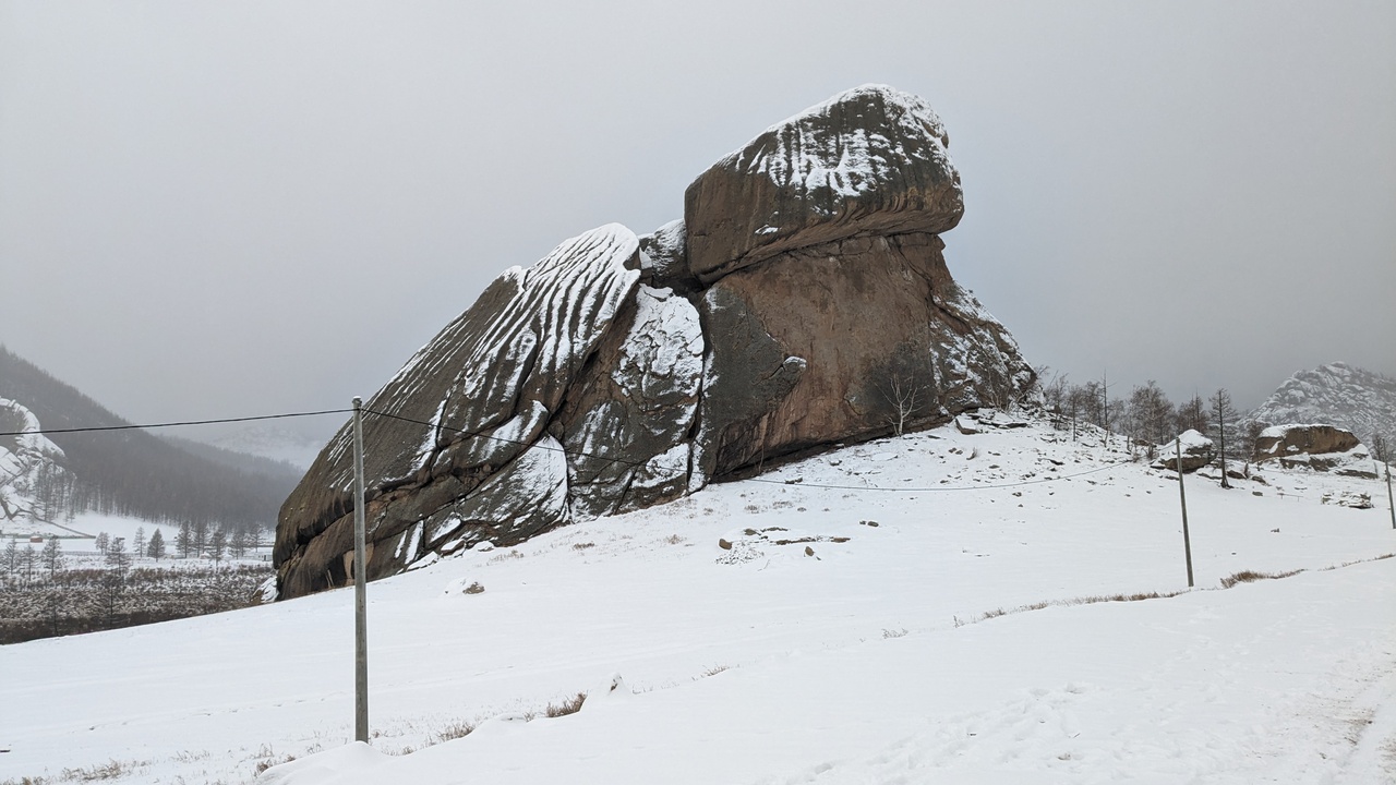観光スポットとして有名な亀岩。アクセスが正直大変ですが、雪をまとった姿は夏とは違う迫力で一見の価値ありです。さらに、空を見上げるとドローンが飛んでいることもあるので、探してみるのも意外と面白い楽しみ方!