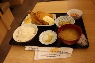 各種豊富なメニューがあり、この日はアジフライ定食。小鉢が選べるのもうれしいサービス。店内にスペースはあるが、フードコートでも問題なし。