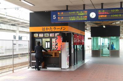 博多駅在来線5、6番線ホームの吉塚寄りにある立ち食いラーメン店。食券を購入しオーダーする。メニューはいくつかあるが、トンコツ系のラーメンが博多らしさを感じる。