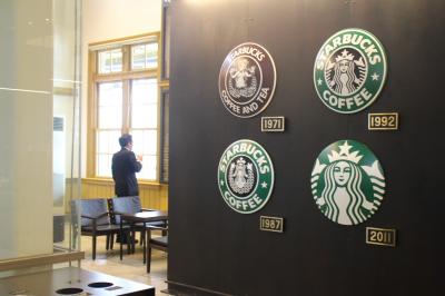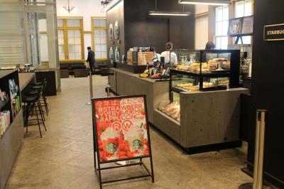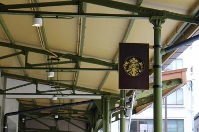 復原されリニューアルオープンした門司港駅内。改札口そばにあるスタバ。
