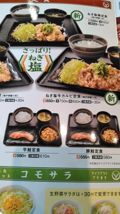 電車EF66の撮影をしに、幡生駅の近くに行った。電車の通過後、近辺でランチするところを捜していると吉野家があったので、入店。メニューに知らないものがあったので、それを注文した。ネギ塩牛カルビ定食を初めて食べたが、美味しかった!これは気に入った!牛丼は昔ほど、食べたいと思わなくなったので、この新メニューはありがたい。定食は650円。
