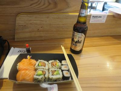握りずしは普通に並んでいるものを見ると、サーモンだけのようだ。確かにサーモンが好きなら問題はない。ただ、そればかり食べることになる。後はアメリカなどでも見るアボカドなどがはいっていたりする珍奇な寿司の体験ができる。アサビ・ビールの小瓶が売っていたので、それと一緒に流し込む。寿司のボックスはテイクアウェイなら5ポンドくらいのはずだが、箸をとって、座って食べるともう少し高くなった。日本のスーパーの寿司弁当のほうが勿論はるかにいいに決まっているが。。。確か9ポンド近く払ったと記憶する。- 旅行時期