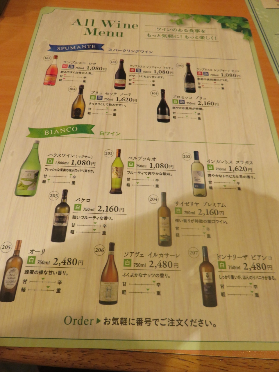 サイゼリヤは全国にあるが、ここは、特別なところだと聞いたので、友人との二次会で立ち寄った。一次会では、いい食材をあれこれ食べることに集中したが、ここでは、実は、隠れワイン・メニューがあると聞いてやってきた。