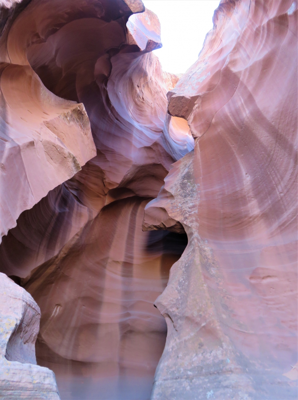 コロラド川の支流の洪水で、小高い台地状の間が浸食され、面白い岩肌の間、200mばかりを往復歩くコース。道路のない砂漠地帯の一部を観光用の車は往復して、運転手が奇岩のある往復の道を案内してくれる。朝早く到着できたのは満員状態を避けるのには、よかった。