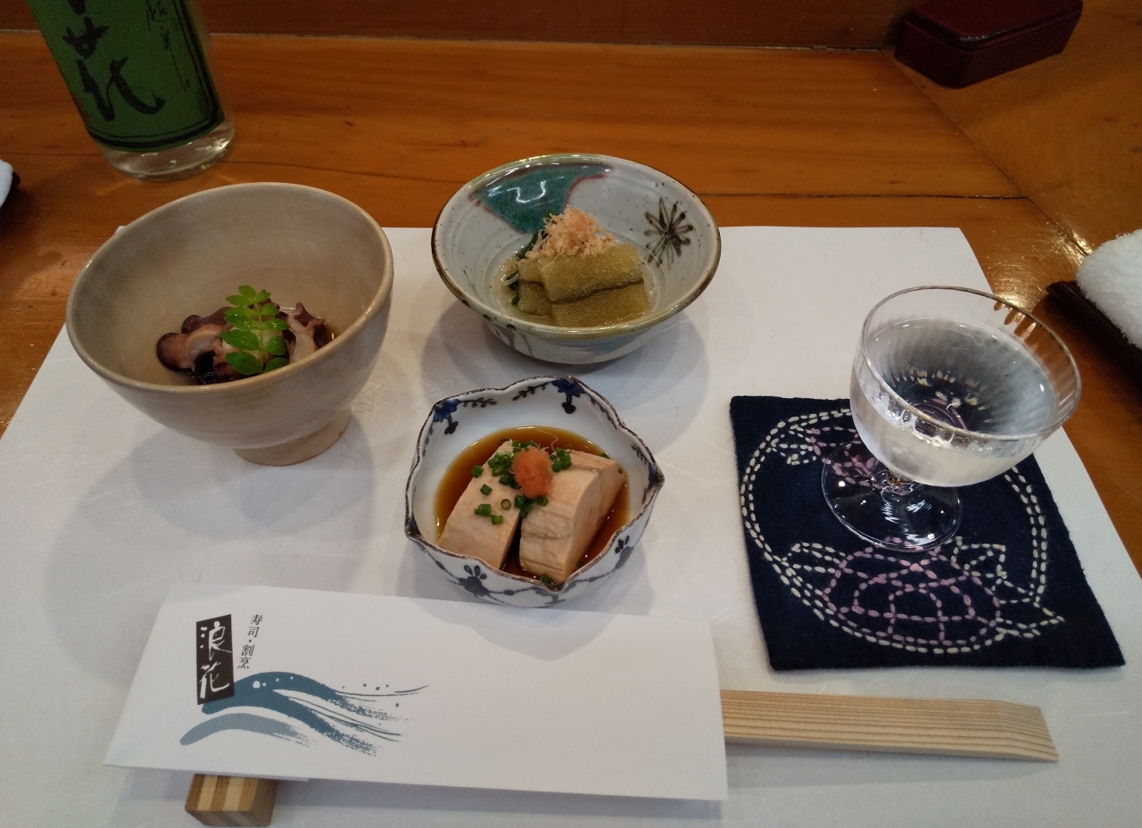 家内とカウンターに座る。最初、5品のどれも美味な料理が出てきた。店の名前(浪花)の入った伝統スタイルの日本酒と合わせた。倉敷の酒だそうだ。コクがあり、どの料理でも合う。