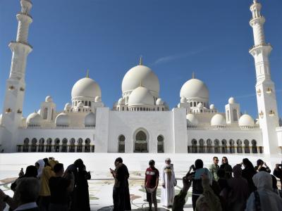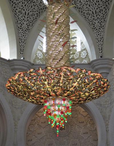 青空のもとで、白い大理石が輝く壮麗なモスクだ。インドのタージマハルも白い大理石で壮麗だが、これに並ぶような建築物のように思える。このアブダビのモスクは世界中から材料を輸入したようだが、大理石はどうやらインドとイタリアからのだろう。内部や天井の装飾はアルハンブラ宮殿のような凝り方ではないが、すっきりと上品だ。シャンデリアはスワロフスキー製とのこと。ヨーロッパで使用されているデザインとは当然異なる仕上げだ。ドバイの新技術満載の建築と好対照で、このモスクは時間がたつともっと味がでそうな気がする。勿論数百年後のことだが。。訪問直前にイランで旅客機が誤爆劇されたが、なんと、このモスクの巨大で壮麗なカーペットは、イラン製とのこと!なんだ、ペルシャ絨毯なのだ。アラブ世界のシンボルになるといいのだが。。ただ、アラブ世界のセクト問題は簡単に解決されそうにはない。。