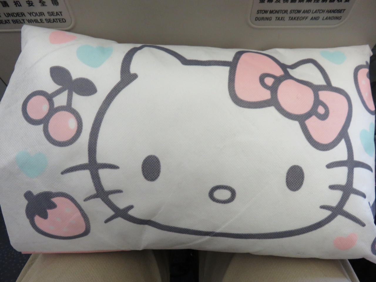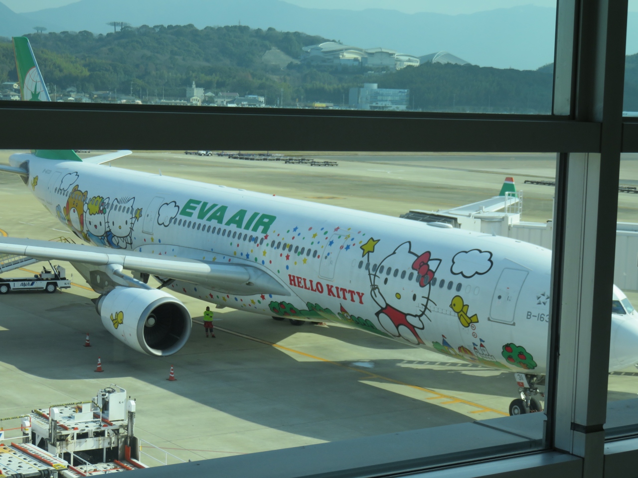 今回、ツアーに参加して台湾に行ったが、飛行機はエバー航空だった。なんと機体にはでかでかとキティちゃんの絵が描かれている!なにしろ、この方面には疎い私だが、孫の真理ちゃんが大好きなキャラクターなので、自然と名称は記憶している。そこで、後で見せられるように機体写真をいつもより多めに撮影した。機内食のフォーク、ナイフ、スプーンや、枕カバーなどもキティちゃんで統一されていた。サンリオは日本製だろうから、台湾の航空会社とのコラボだろう。日本贔屓の多い台湾とはいえ、嬉しい気持ちになる。