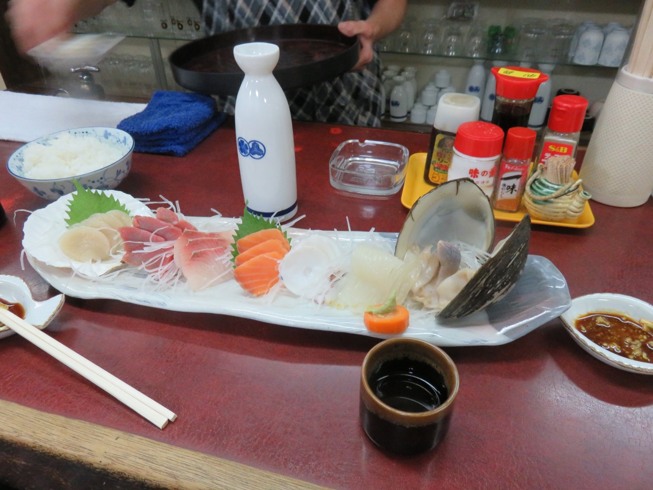 ドーミーイン・ホテルの近所で、5時半過ぎにここに入店。すぐに席は一杯になった。地元の顧客が多い店だと感じた。こういうところは一杯やりながら、地元の美味しいものをいただくには最適だ。まずは刺身の盛り合わせを注文。どれも美味しい!とくに大きな貝にのった白い刺身はほっき貝だという。寿司屋では赤い湯がいたものしか見ていないから、珍しかった。下関では生は見ていない。他の刺身も美味しかった。いか、ほたて等。。