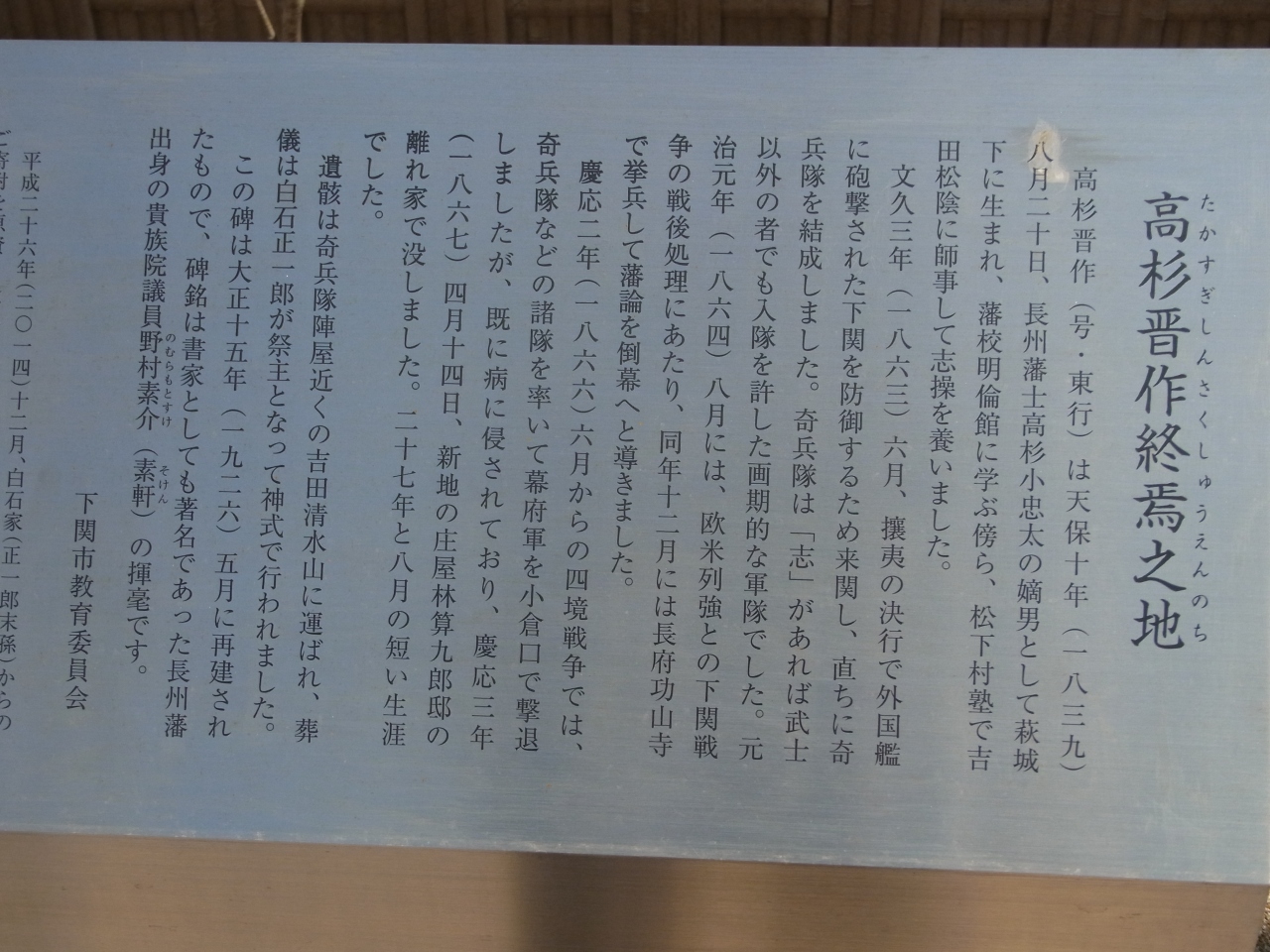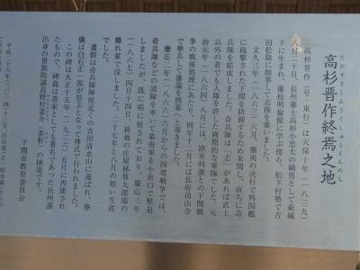 久し振りのこの終焉の地を訪れた。前より整備されて、説明版などがついていた。下関教育委員会の作成した掲示板があるが、晋作の臨終の時に誰が看取ったかの説明はなかった。確実な話ではないからだろうか。。おうの、野村望東尼などの説は聞いたことがあるが。。それにしても、29歳になる前に一生を終えたのだ。。。