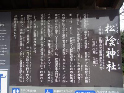 境内の中で、寄進された燈籠のその名を確認しながら見ていくと、顔ぶれが流石だ。伊藤博文が右側中央寄りの最初にあるのは、納得。墓地も大げさでないのがいい。復元された松下村塾もあいにく内部は見えなかったが、違和感はない。豪華さとは無縁なのだ。近年、松陰先生関連また弟子たちの関連本もかなり読んだ。彼らの行動のいくつかを思い出すだけで、この地にいることの意味が、突き刺さるように響いてくる。松陰先生の心意気に弟子たちは一気に、または、時間をかけて引き込まれていったのであろう。ペリーの船に拒否されて五年後の一八五九年に留魂録が書かれて刑場に赴いて、なお、維新が来るには九年も要したことなどを考えた。僅か半年かそこらの松下村塾での薫陶がどれほどの影響力を与えたかを思うだけで、その凄味が理解できるように思うのだが。。。
