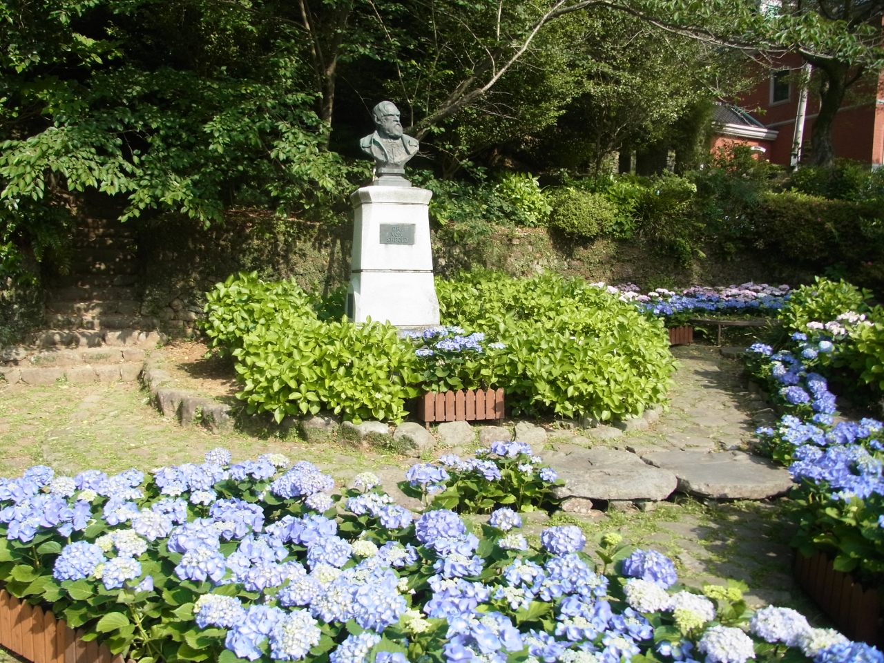 なお、今回の訪問日は、ちょうど、あじさいが咲き乱れ、「おたきさん」からきたといわれる「オタクサ」が記念館の庭や隣の鳴滝塾、今の「シーボルト宅跡地」にも咲き乱れていて美しかった。