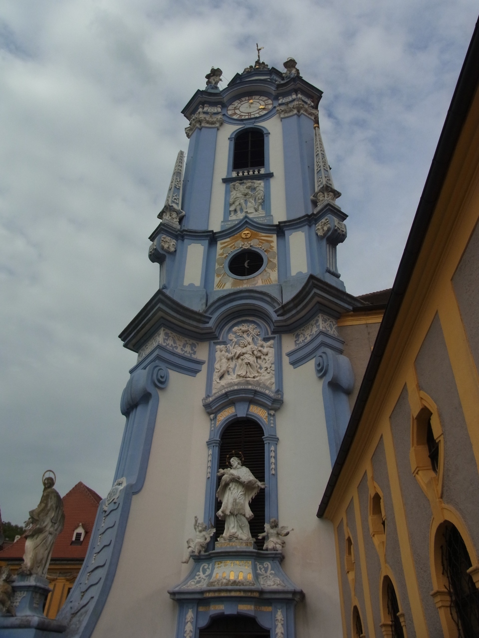 小さなワインの村の「ウェッジウッド」風の教会の塔ー正式にはStift Dürnsteinというところ。