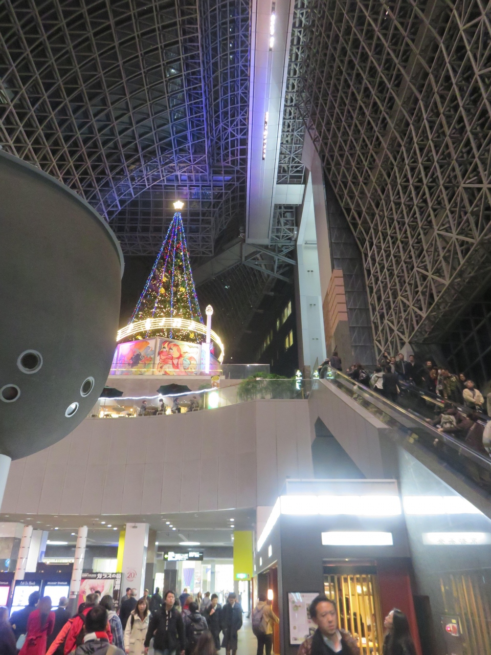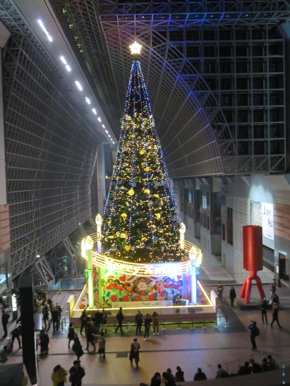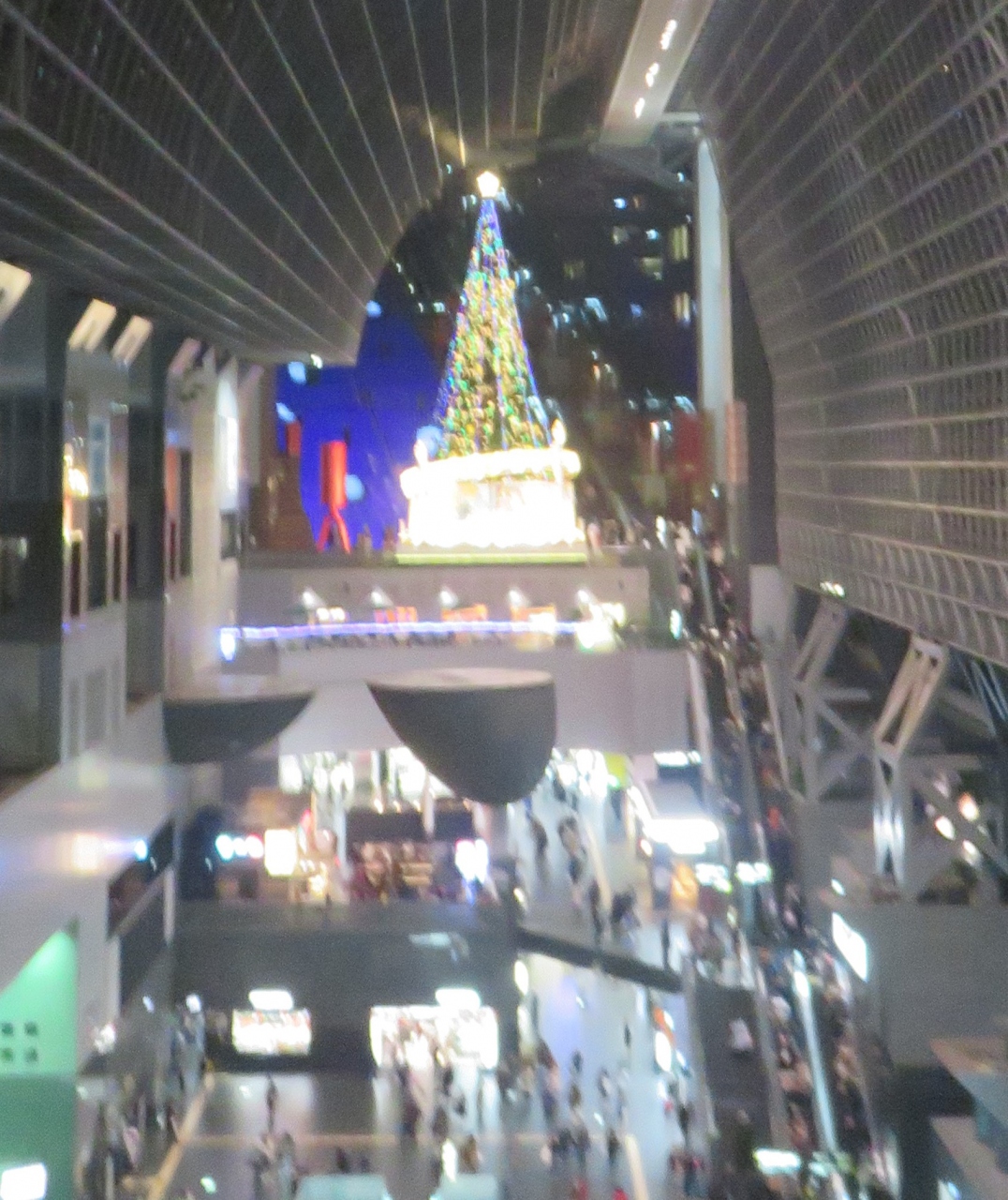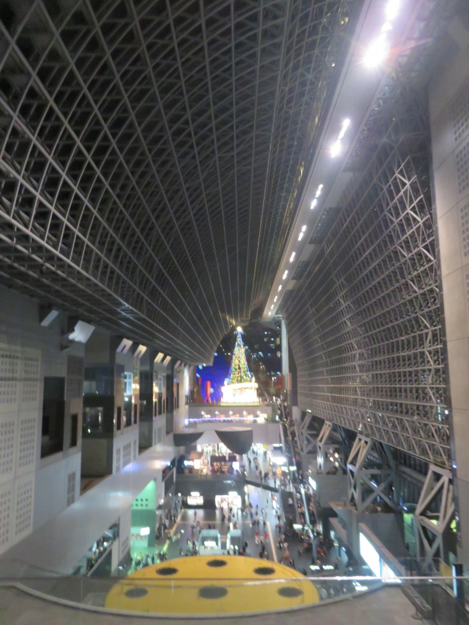 京都駅のビルはいつ来ても豪快なスケールにワクワクさせられる。数日前は巨大なクリスマスツリーを見た。階段で上まで上がると、なんと壁面の反射で、ツリーが3個に見えるところがある!さらに反対側のエレベーターまで、天空の通路を歩いて行くと、別の巨大な空間を見せてくれる。