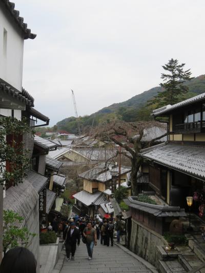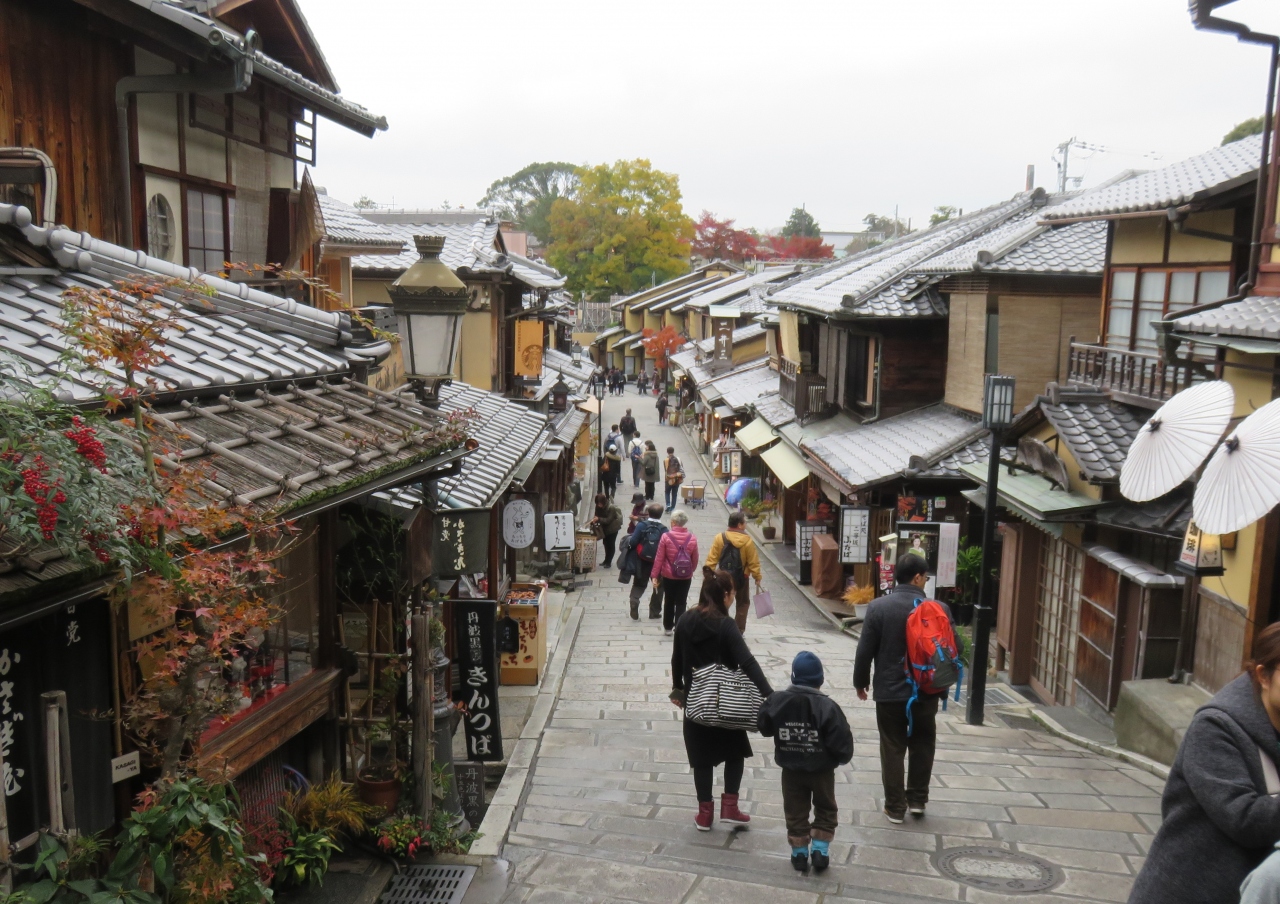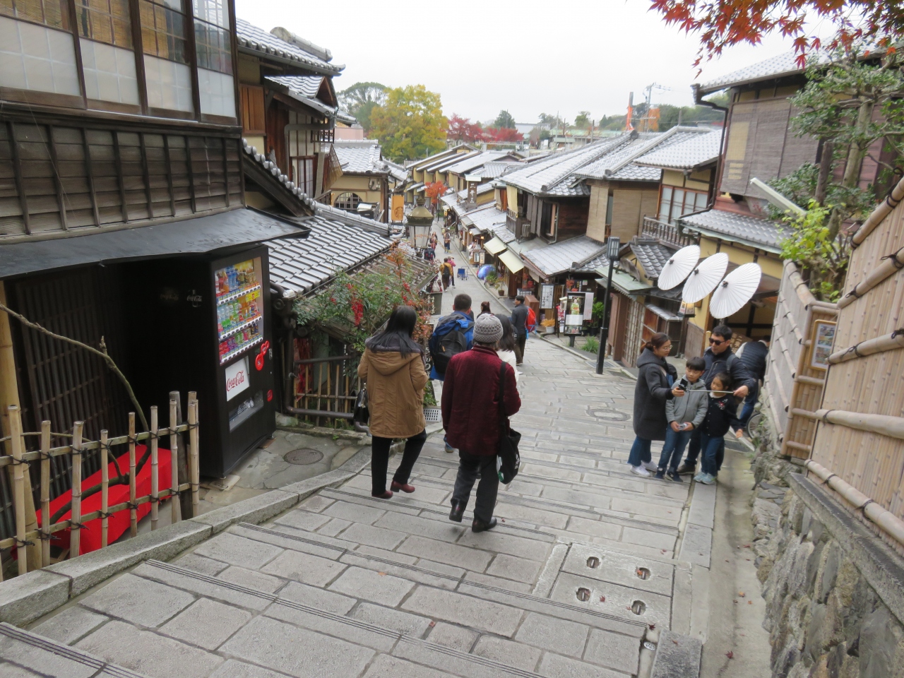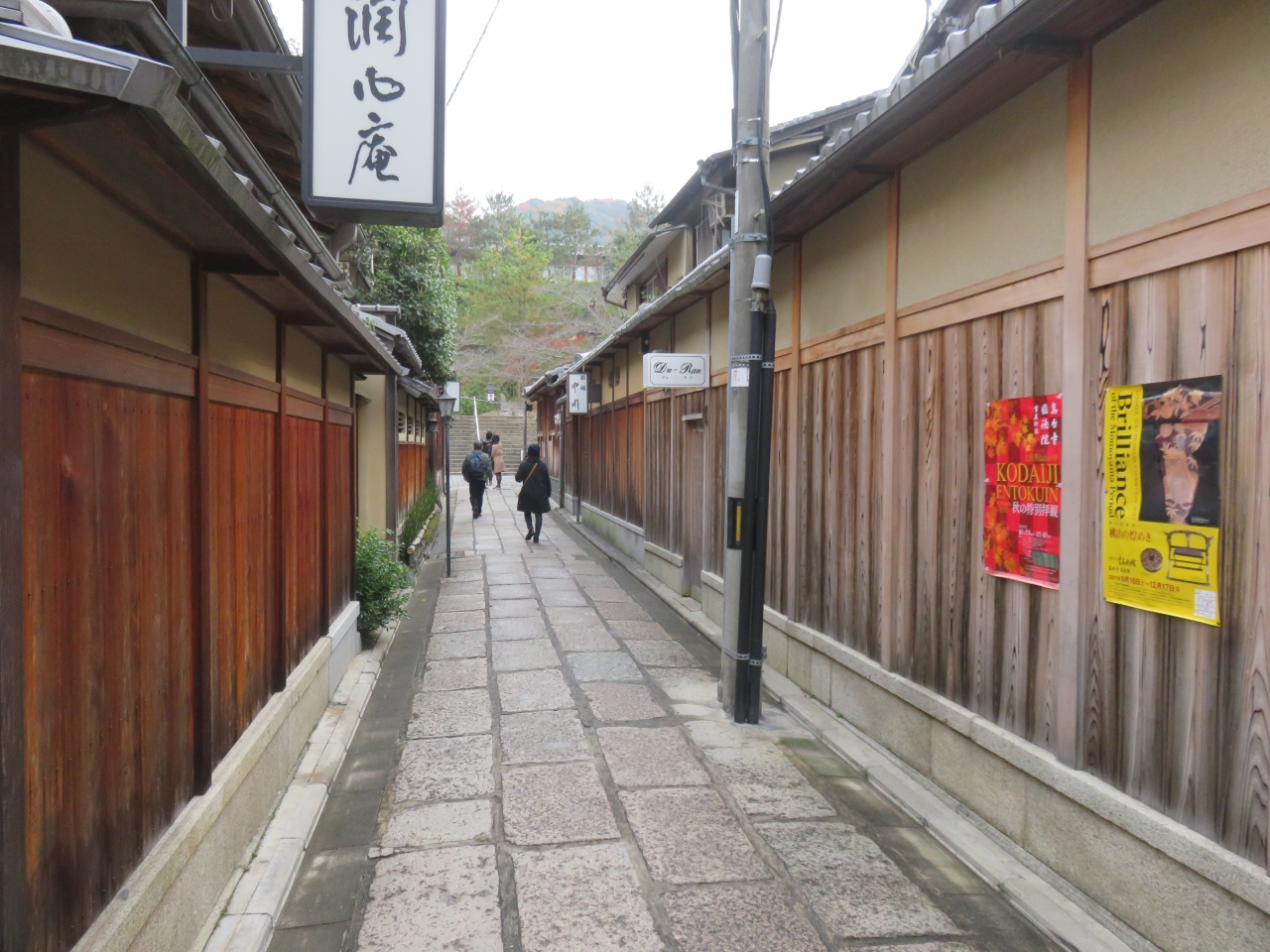 八坂神社からねねの道をとおって、一年坂、二年坂、三年坂という名称がつけられている通りを歩き、さらに清水坂に入ると、ごった返してくる。海外の人に大人気のコースだ。途中、八坂の塔や高台寺に入る人もあるだろう。石塀小路もある。ともかくも、この近辺は見どころが多いし、伝統的なスタイルの建物群が並んでいるので、海外からの着物姿の人たちも溶け込みやすく、たくさん歩いている。
