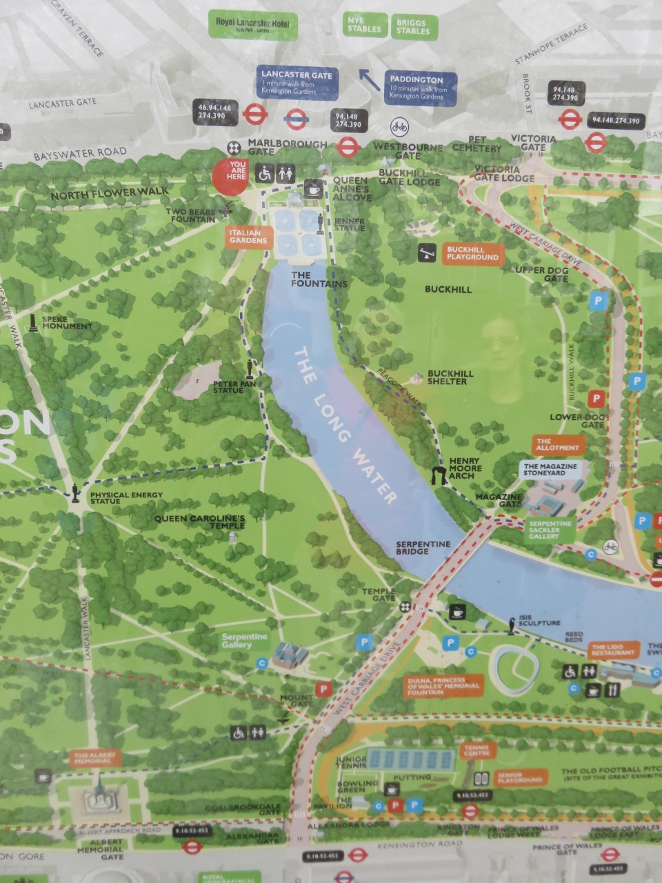 ゆったりしたランチの後、運動を兼ねて、ケンジントン・ガーデンズのクイーンズウェイあたりから、ハイド・パークの端まで散歩した。2キロ以上楽にあるが、公園内を愛でながらだからあっという間に西から東まで歩けた。