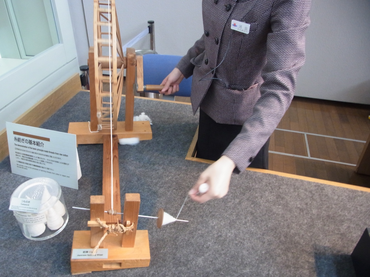 綿を紡ぐ作業の仕組みを係員が丁寧に実演してくれる。一方向に捻りながら引っ張ると綿花がするすると糸になる!初めて体験させてもらい、実感できた。後はより便利に楽に作業をこなす装置をつくればいいわけだ。豊田一族の開発の歴史を示す装置等がずらっと並ぶ。2000年代にいたる発展の歴史をしめる実物がおいてあるのは壮観だ。