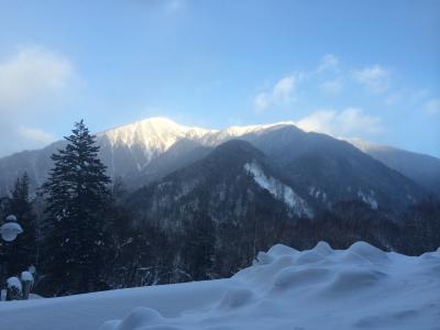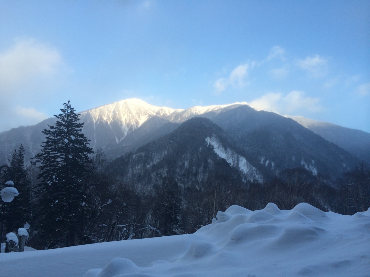旅館からは目の前に霞沢岳が!!雪が降っていたのでクリアではなかったけど、大迫力でした。左に焼岳、さらに奥には穂高岳が見えるそうですが、この日は穂高岳は見えませんでした。