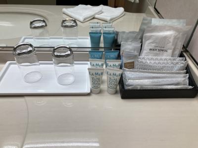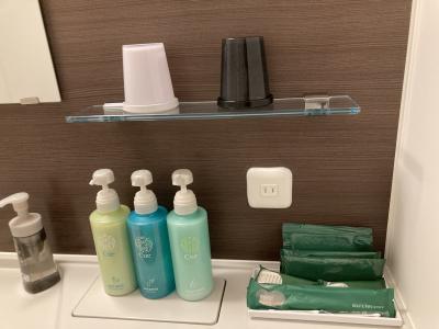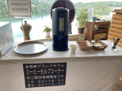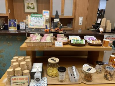 アメニティはフロント前ロビーにあり、そこから自分で持っていく形です。サービスのコーヒーサーバーもロビーにありました。
