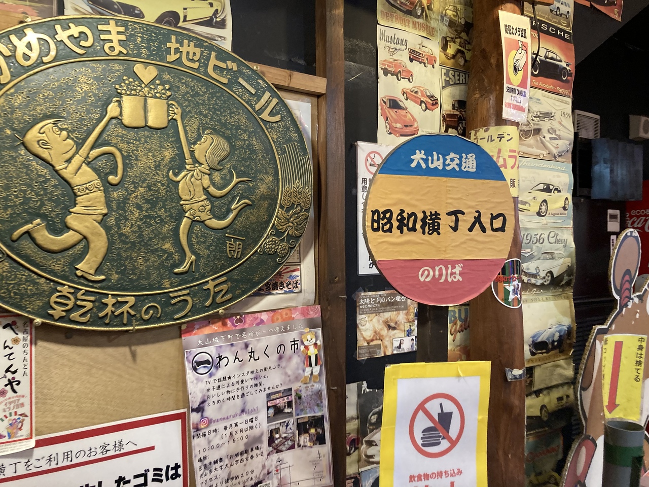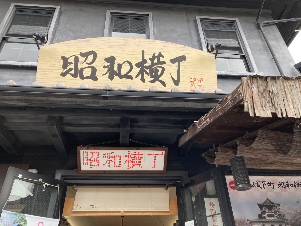 犬山な城下町通りの中ほどに、昭和横丁の名前の看板があり、何やら薄暗い中を入っていくと、屋台みたいな飲食店が両脇に並んでいます。