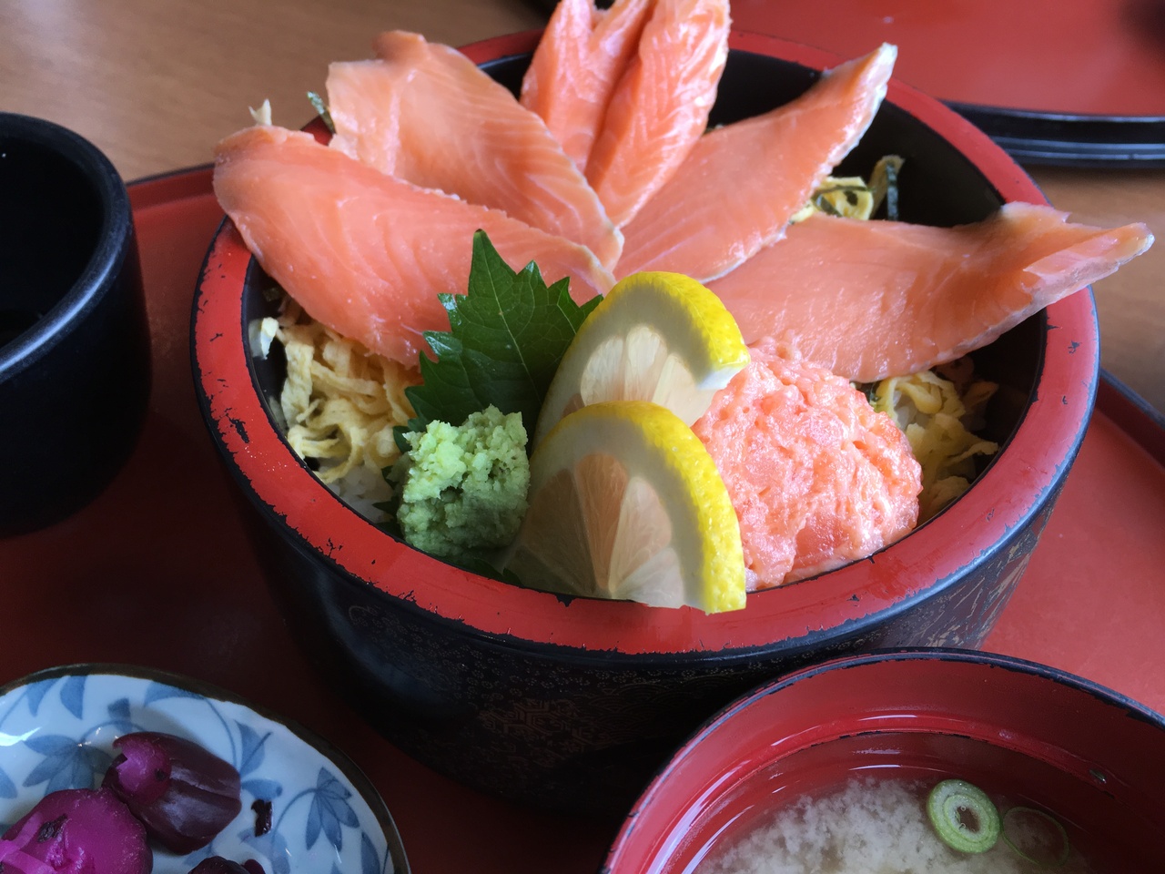 道の駅の二階にある海鮮レストランです。漁港を見下ろす位置にあり、仕入れた魚を使った料理がたくさんあります。定食はどれもかなりボリュームがある様子でしたので、今回は生サーモン丼を頂いてみました。サーモンのお刺身がのっているだけでなく、サーモンのネギトロバージョンものっていて、すごく美味しかったです。美味しいお魚が食べたい時におススメです。