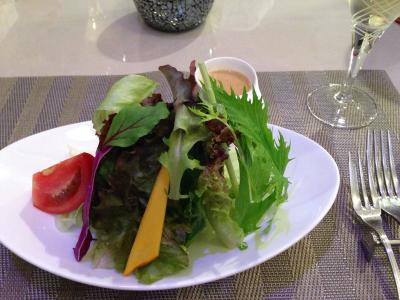 待ちに待ったお夕食。時間が決められていて用意ができると部屋に連絡を入れてくれます。期待をこめてテーブルに着きましたが、メニューはホームページや今まで行かれた方のブログなどに載っているそのままのメニューでした。フレンチと和風の融合のような感じで、美味しいか美味しくないかと聞かれたら美味しいけれど、オーベルジュというレベルのお食事かというとどうなのかなと思ってしまいました。食事前と途中でワインのハーフボトルをそれぞれ1本ずつオーダーしたのですが、用意されたワインは美味しいけれど激安ワインと言われるワインで、それならそれで良いけれどワインの説明もテイスティングも一切なしで、ハーフボトル1本の値段が一般的なそのワインのフルボトルの3倍の値段だったのはサービス料を考えても不思議な気がしました。
