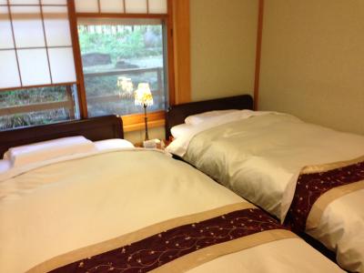 いつも夫婦の時や一人の時は二階の部屋を希望しますが、今回は大所帯でうるさくしてはと思い、下の3部屋に泊まりました。下の2部屋は広いお庭があり、貸し切り露天風呂にもそのお庭から行けるので便利でした。私たち夫婦が泊まった1階の部屋は唯一の和室(でもベッド)ですが、思いのほか明るくて広くて良かったです。