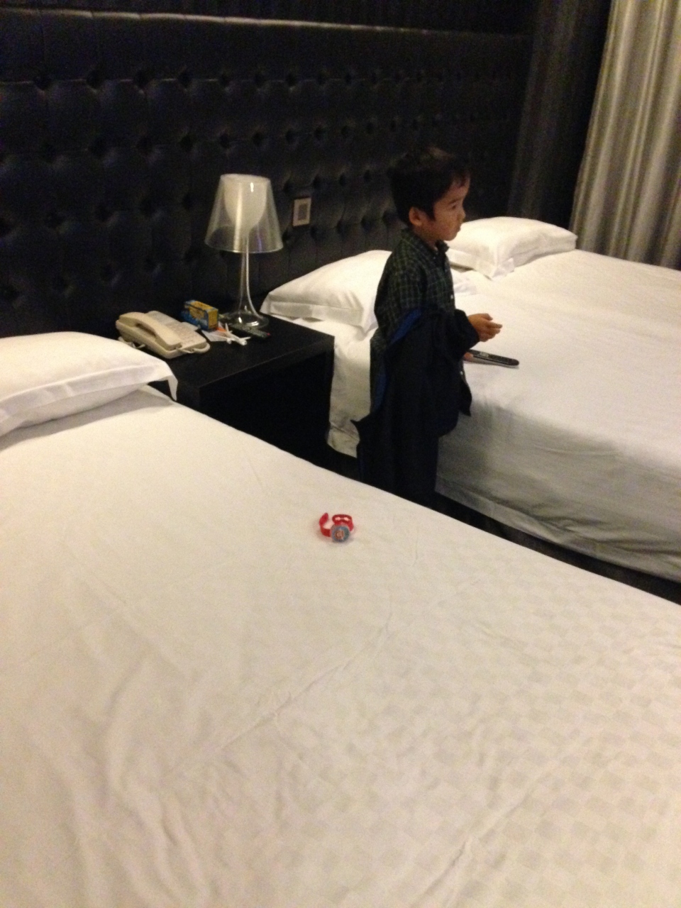 ベッドはシングルベッド(120cm幅だそうです。)を2台くっつけてもらいましたが、大人2人、小学校高学年1人でも窮屈ではありません。