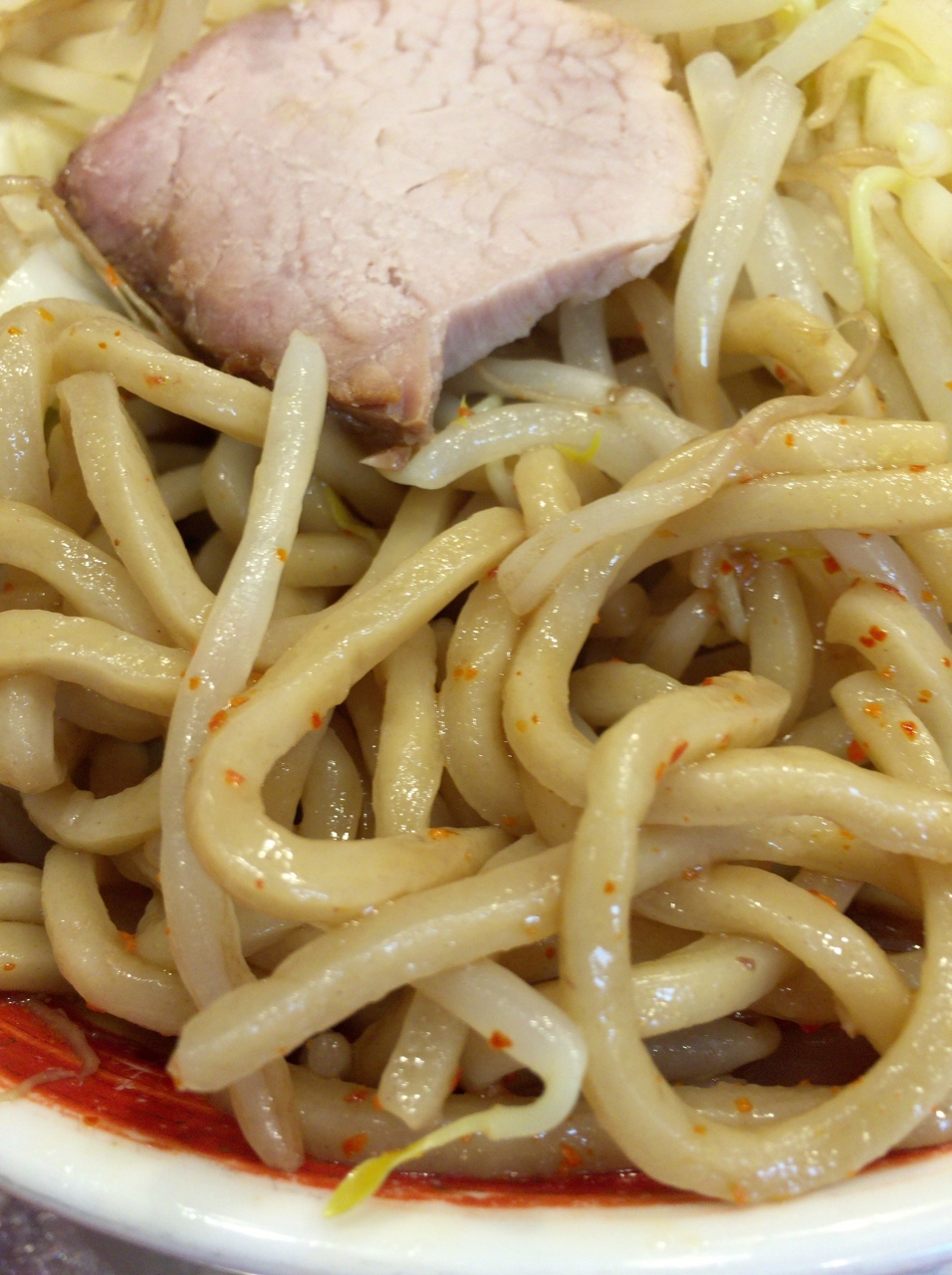東急大崎広小路駅を出て、山手通り沿いにある二郎系のラーメン屋さん。中に入ると左手の自動販売機で食券を買って、並んでいるとスタッフに見せるように促されます。ラーメン小@700円を見せてから、油少な目を告げます。