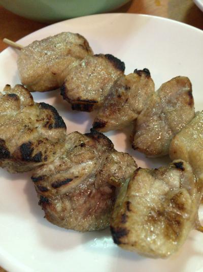 ホッピーを頼んで、適当にもつ焼きをいただきます。子袋・タン・ハツといただき、小袋は想定内でしたが、タンとハツの大きさは想定外です。いくら芝浦食肉市場が近いといってもここまで大ぶりにしなくても…という気もしながら、実はモツ好きオヤジとしては嬉しかったりします。