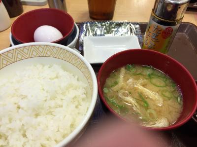 品川駅港南口方面に出て、斜め右方向の歩道橋を降りたところにあるチェーン店の牛丼屋さん。朝ご飯に、卵かけご飯定食@220円をいただきました。ご飯と味噌汁に生卵に小皿のひじきが付きます。これで、220円なら文句はありません。