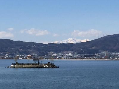 上諏訪駅方向から諏訪湖畔に出て、下諏訪方面に歩くと湖畔を一望できるような展望スポットがあり、晴れた日にはそこから槍穂高がくっきりと見えます。