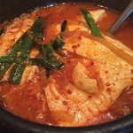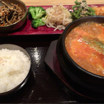 スンドゥプチゲ定食をオーダーします。着盆と同時に気分が晴れやかになります。4種類の野菜ナムルが結構なボリュームで食べ応えバッチリです。チゲもお約束通り、グツグツと煮えたぎった状態でした。お味の方は、ちょっと香辛料が独特です。洋風のスパイスが効いている感じです。- 旅行時期