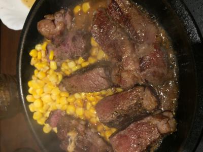 ステーキはじゅうじゅうの鉄板でサーブされ、その鉄板の上にソースをかけて自分で焼く方式です。