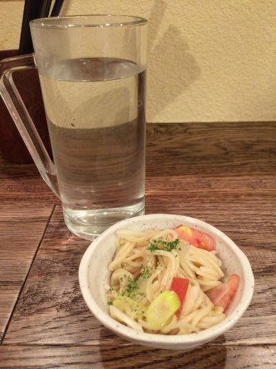 ワンドリンクで焼酎お湯割りをチョイス。付き出しは、細いパスタサラダ風。そして、野菜天ぷら「茄子&椎茸」です。所要時間長くても30分のワンコインコースを楽しむことができました。- 旅行時期