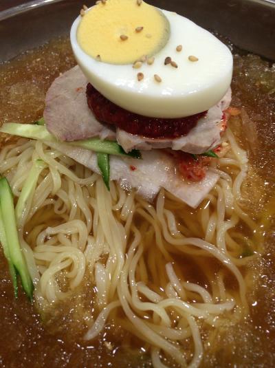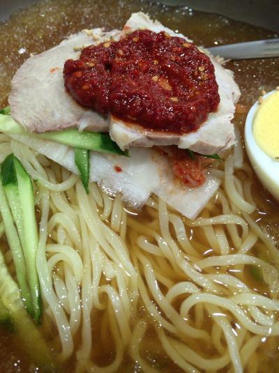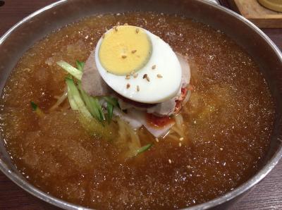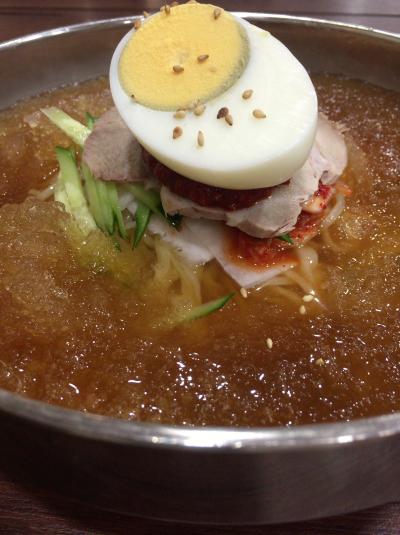 見た目で圧倒されました。丼一面の氷です。流氷の世界に入り込みます。ゆで卵の下にお肉とヤンニョンが仕込まれています。麺は、ツルツルのいい感じの食感です。これは、冷たい出汁でいただくにはもってこいです。辛子を投入して、ますますおいしくいただきました。- 旅行時期