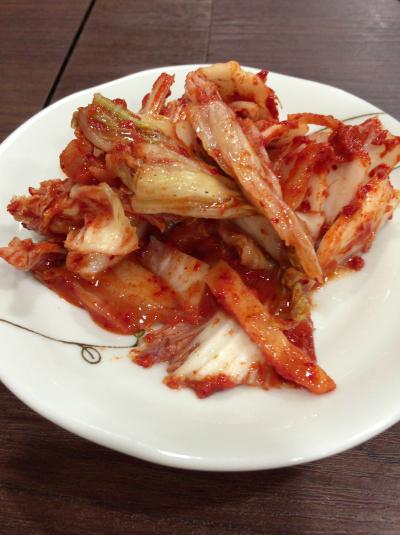 まずは、付き出しのキムチが先にサーブされます。そして冷麺着丼です。