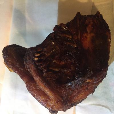 油が飛びますので紙ナプキンを用意してくれます。肉を転がしながら赤い面を焼きます。まあ、焼けた頃合いを見ていただきます。全般的にカタメな印象です。1000円台でステーキですから、箸でちぎれるものが出てくるは思っていませんが、立ち食いで結構力を使うようなものも想定していませんでした。