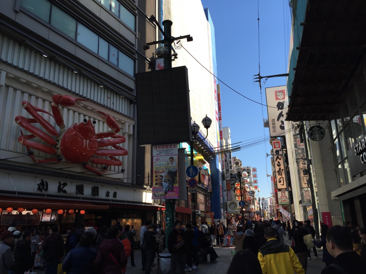 戎橋のグリコをはじめ、かに道楽の蟹のオブジェ、大阪太郎の人形、づぼらやのふぐ、金龍ラーメンの龍などところかまわずに頭の上を行き交いする大阪一の繁華街です。